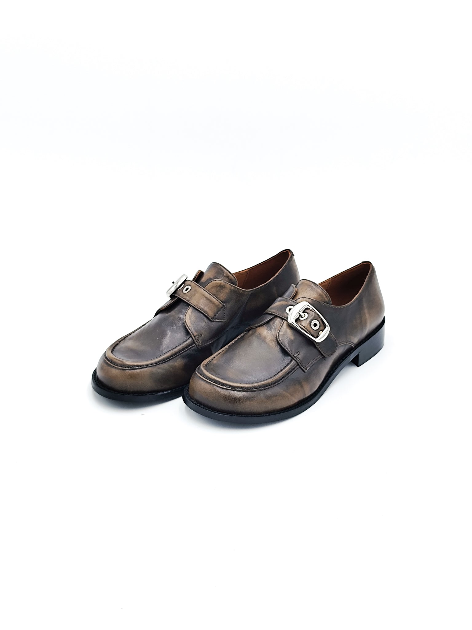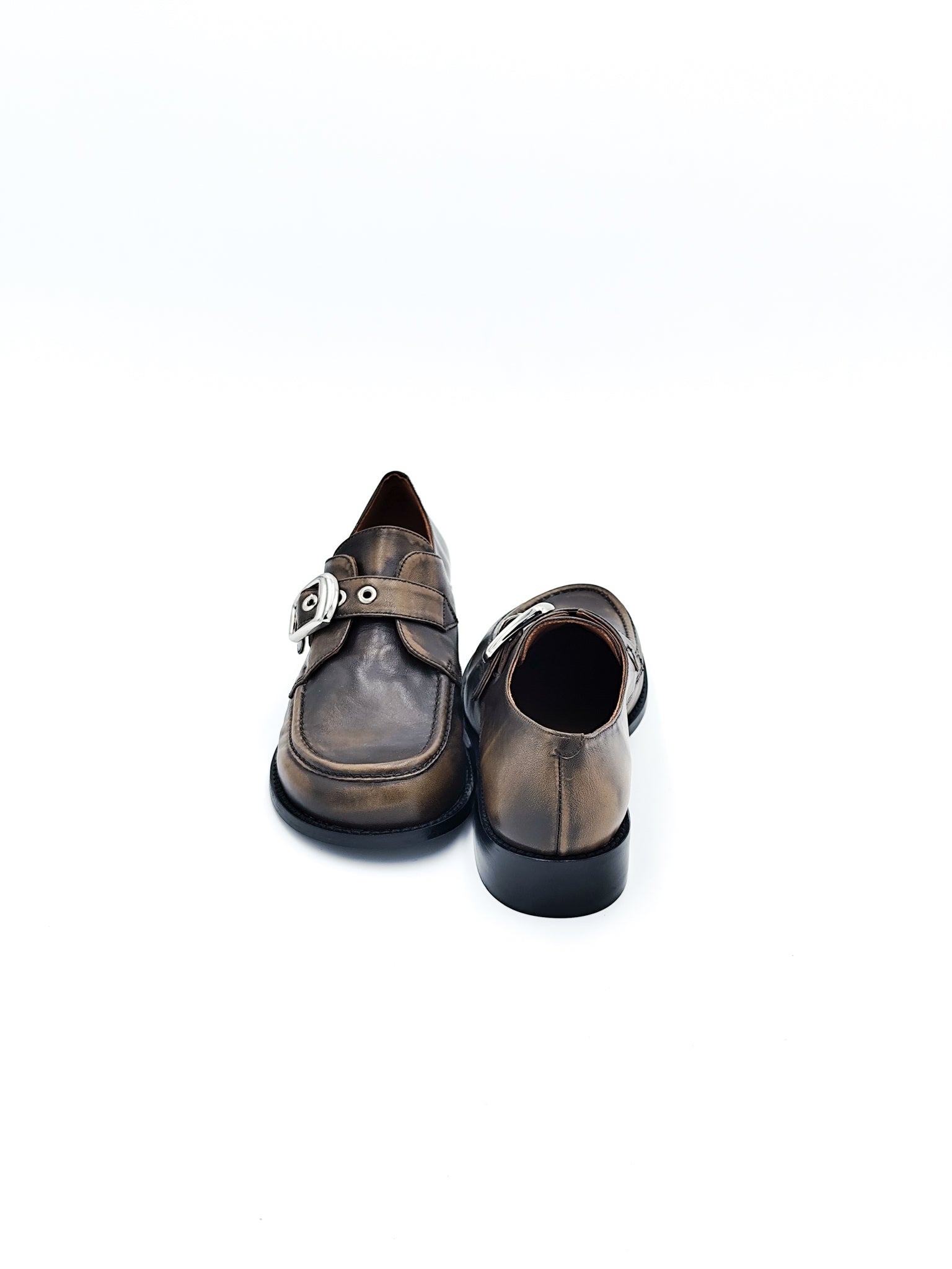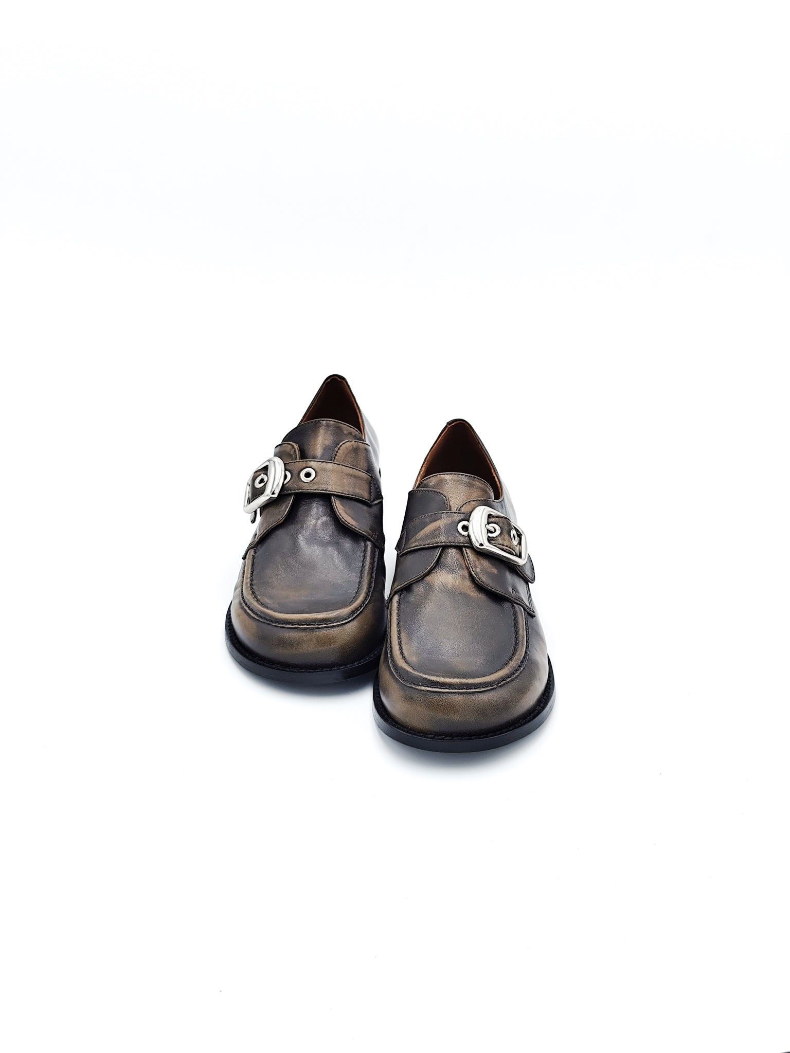 Mocassino in pelle marrone con fibbia metallica frontale. Design raffinato e suola robusta per un equilibrio perfetto tra comfort e personalità.