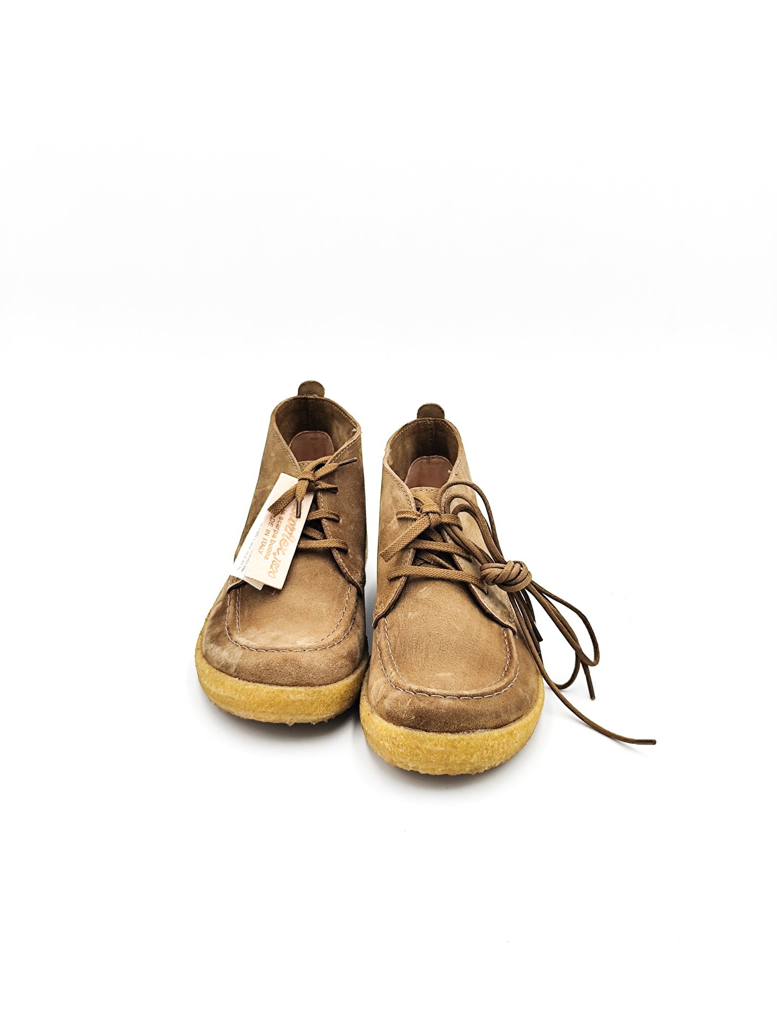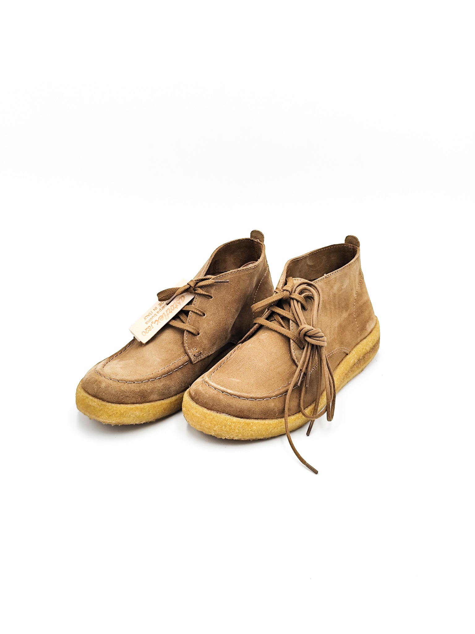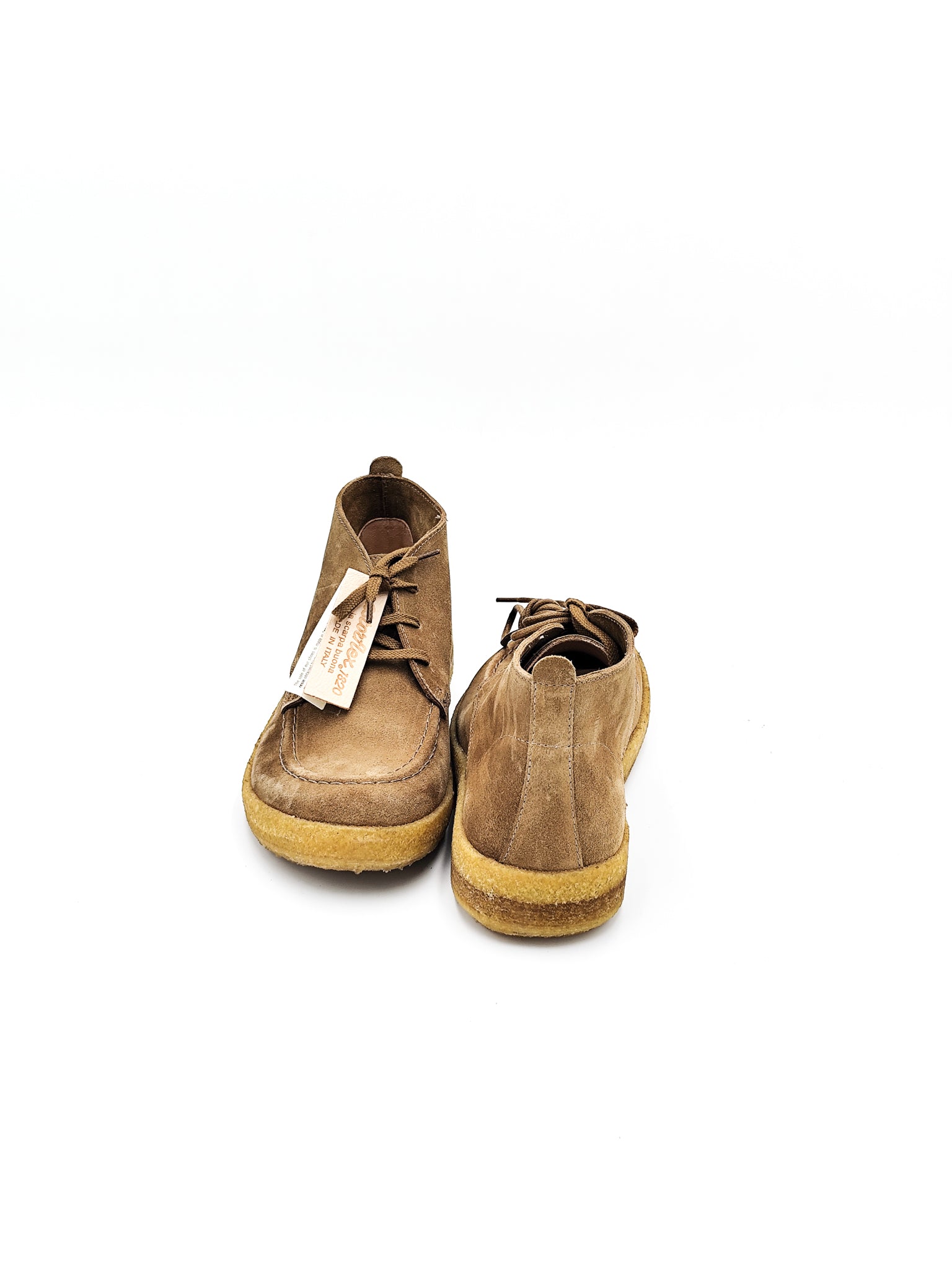 Polacchino in camoscio beige con suola in gomma effetto crepe. Leggero e flessibile, offre comfort quotidiano e un look casual raffinato.