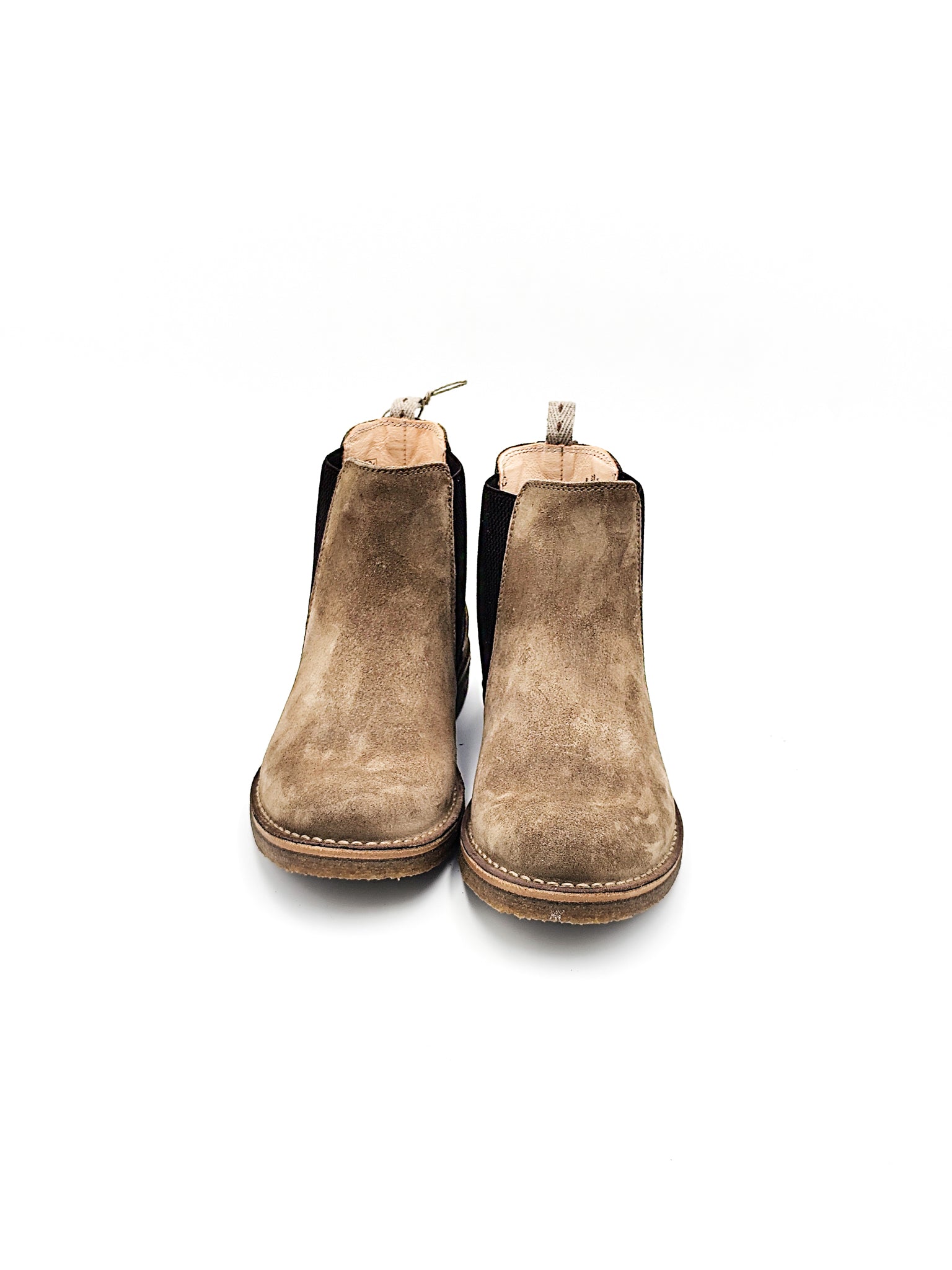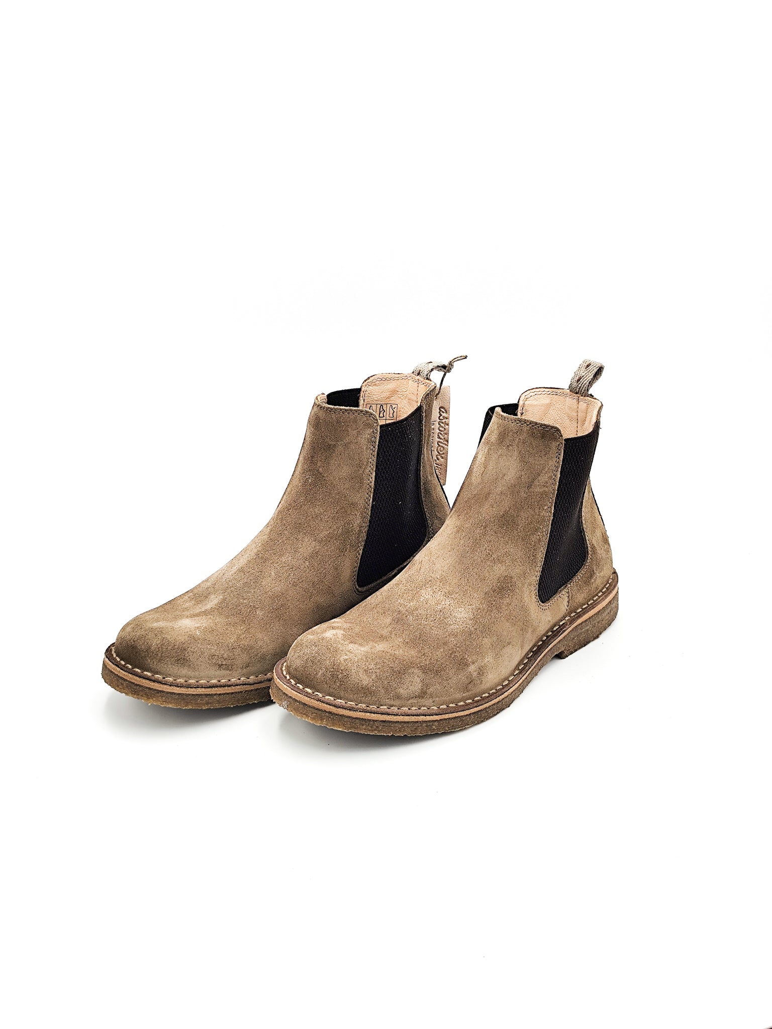 Stivaletto Chelsea in suede beige con inserti elastici e fondo in gomma. Design essenziale, comfort naturale e stile senza tempo per ogni occasione.