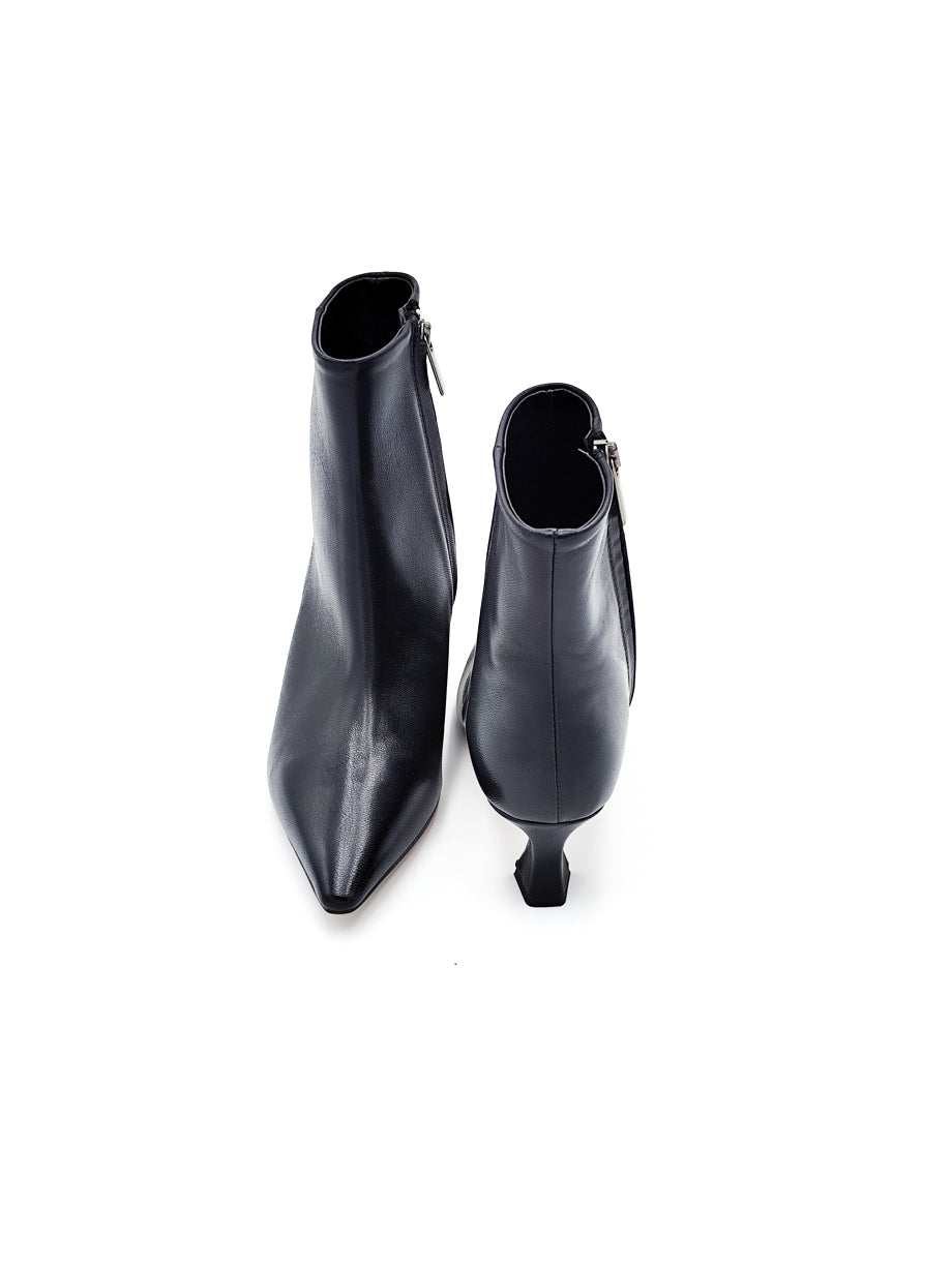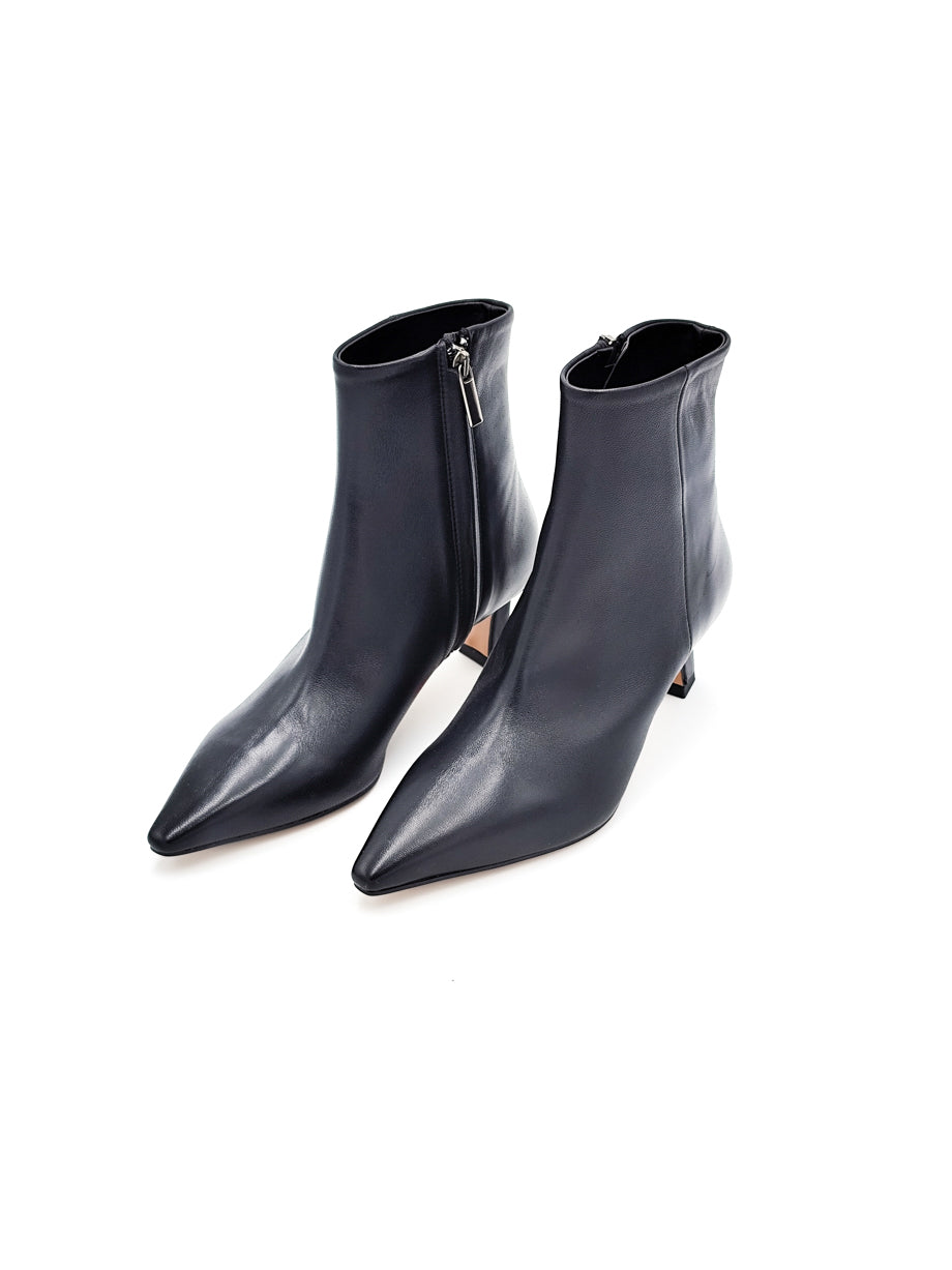 Stivaletto in pelle nero, punta affusolata e calzata regolare e facile da indossare sia con gonne che pantaloni. Fondo gomma e altezza tacco 5 cm.