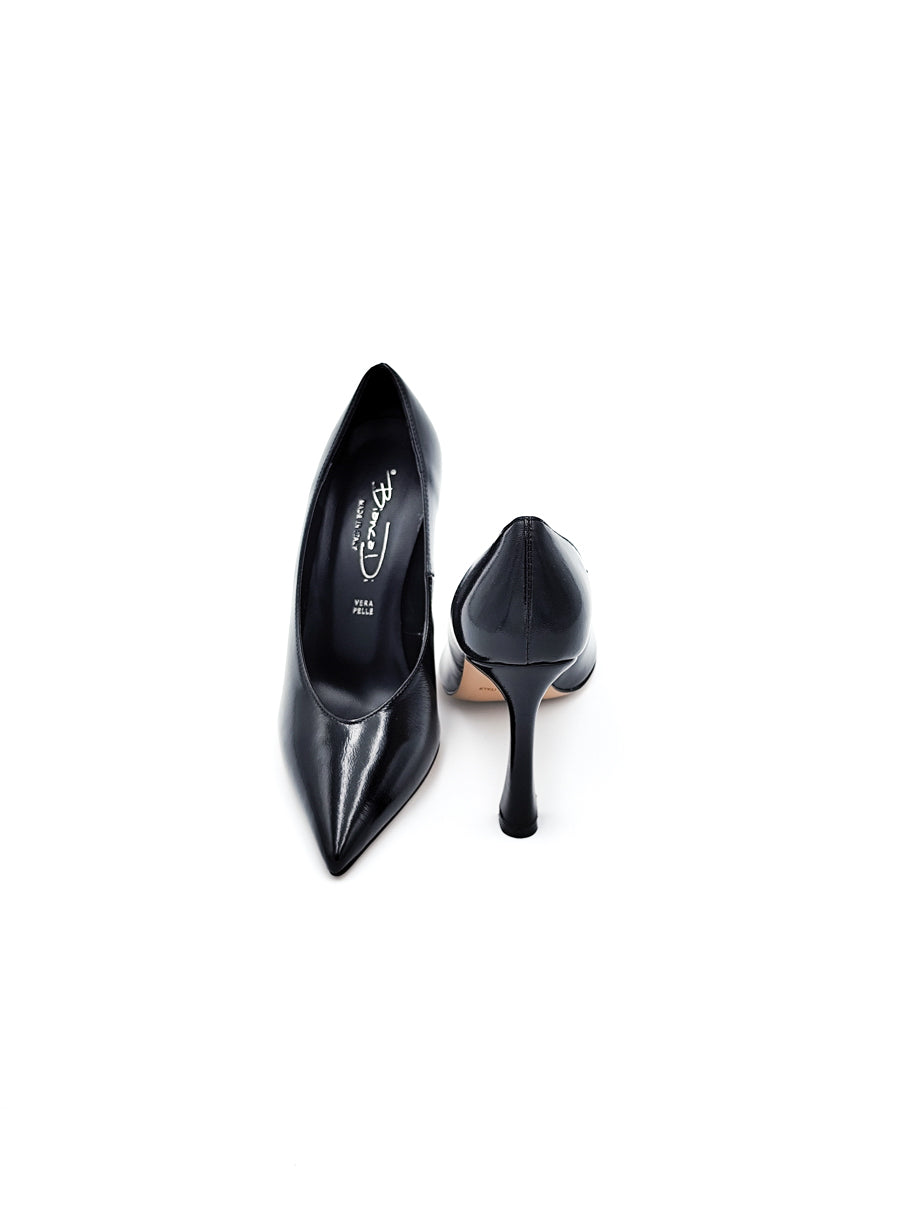 Décolleté in pelle nera, eleganza e quotidianità al tempo stesso per gli amanti del tacco alto. Fondo con 1/2 piantina in gomma e altezza tacco 9 cm.