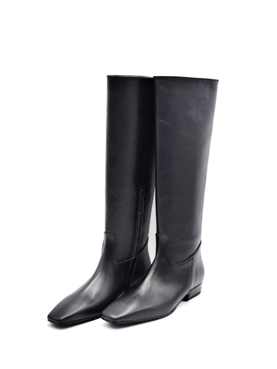 Stivale in pelle nera dal design essenziale e punta affusolata. Calzata morbida e regolare, perfetto per un’eleganza naturale e senza tempo. Altezza tacco 2,5 cm fondo gomma.