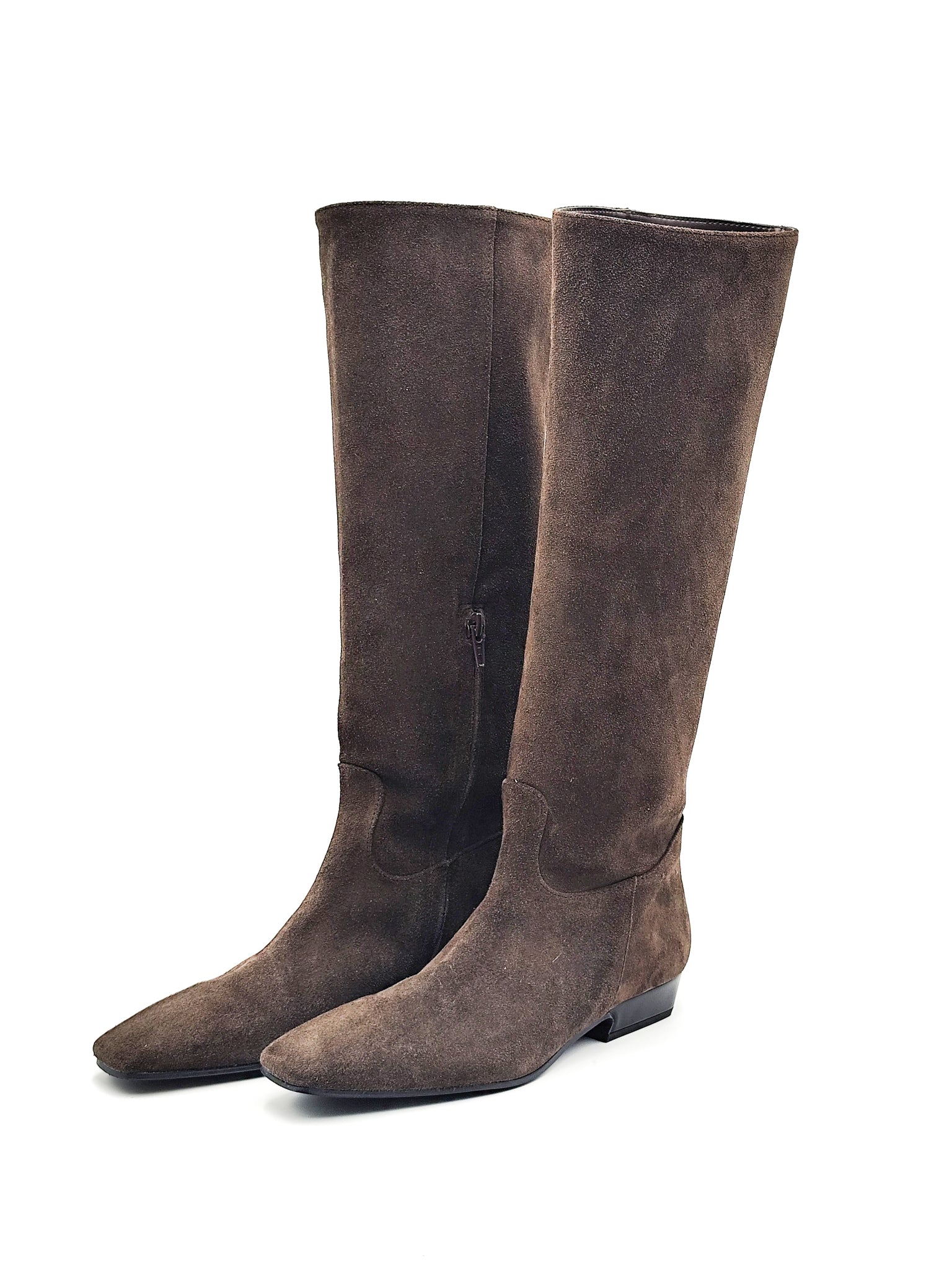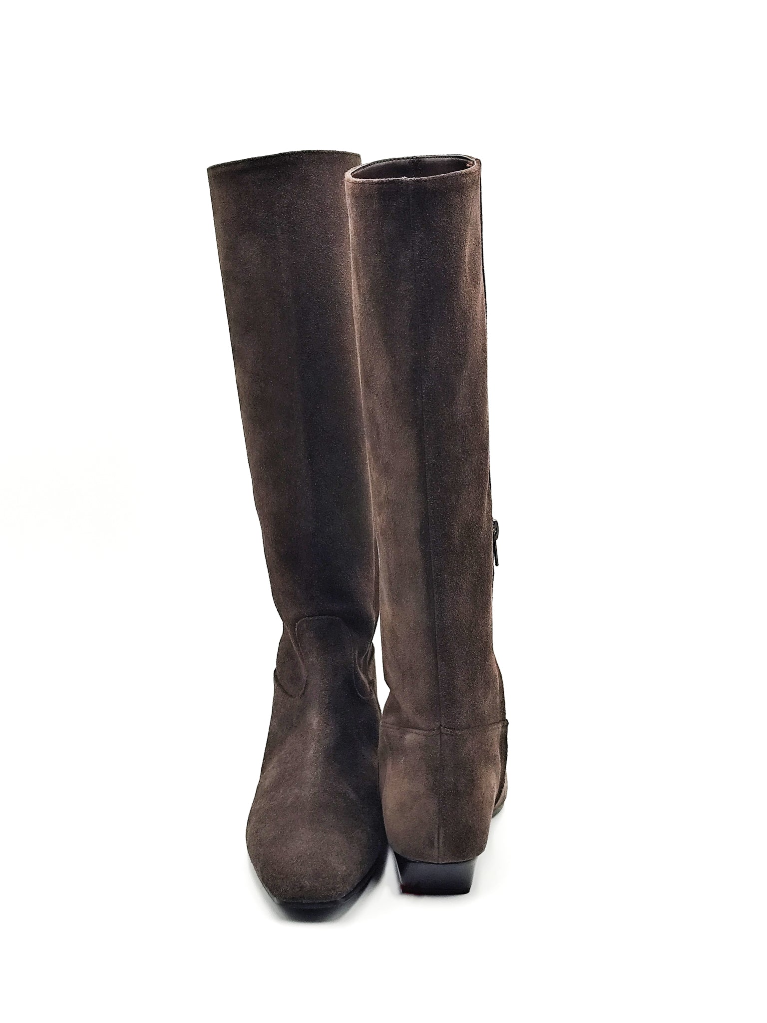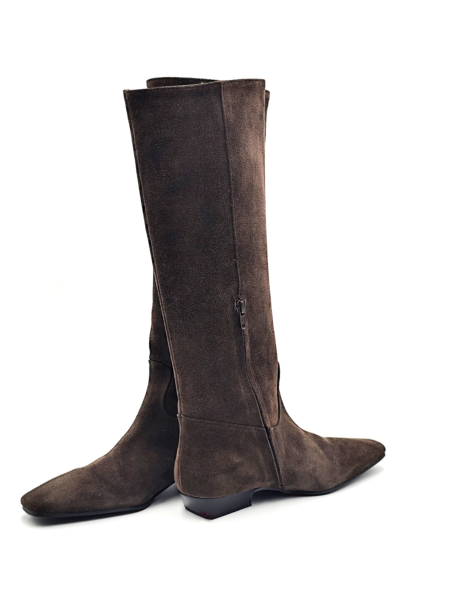 Stivale in camoscio marrone dal design essenziale e punta affusolata. Calzata morbida e regolare, perfetto per un’eleganza naturale e senza tempo. Altezza tacco 2,5 cm fondo gomma.