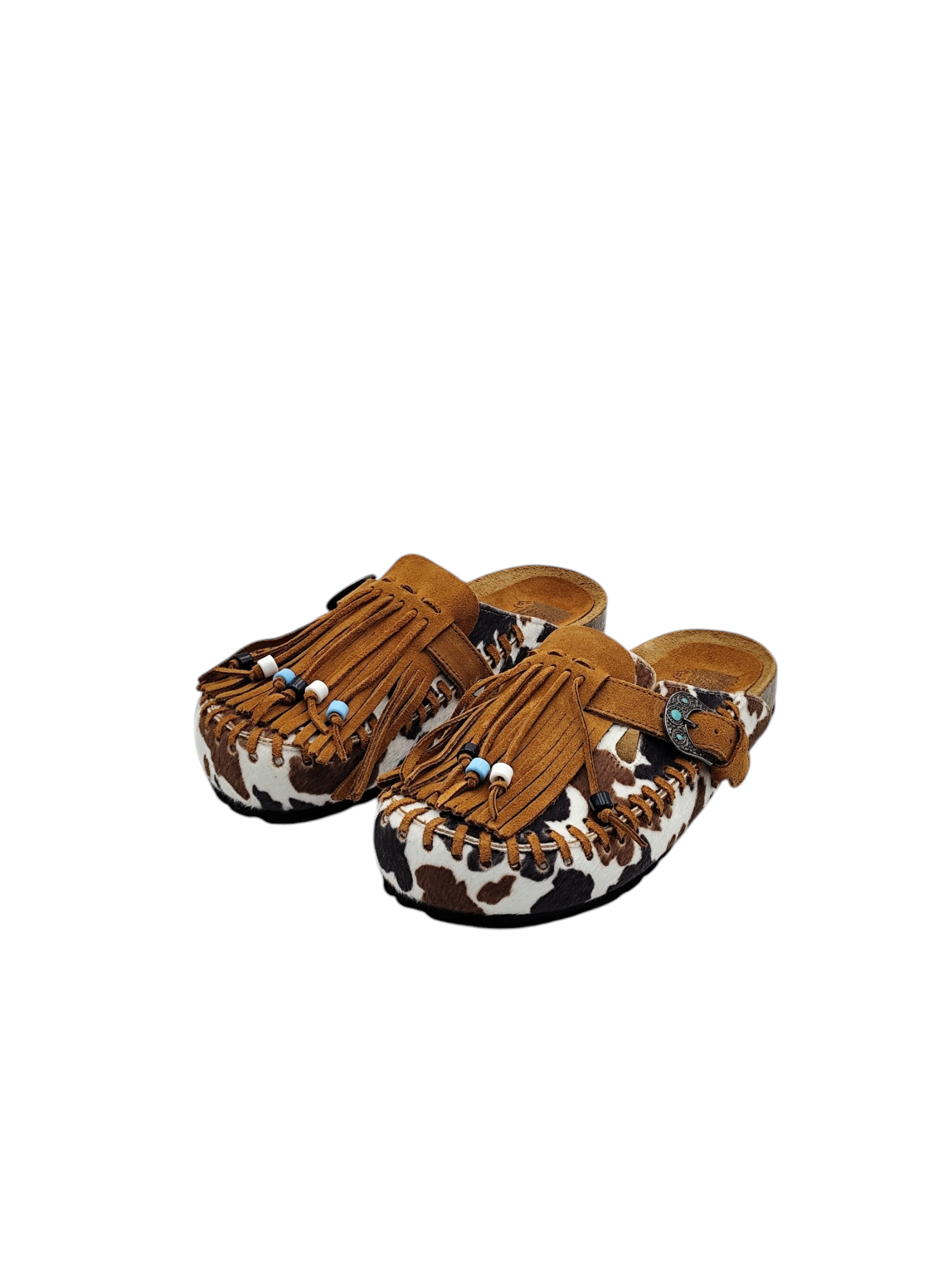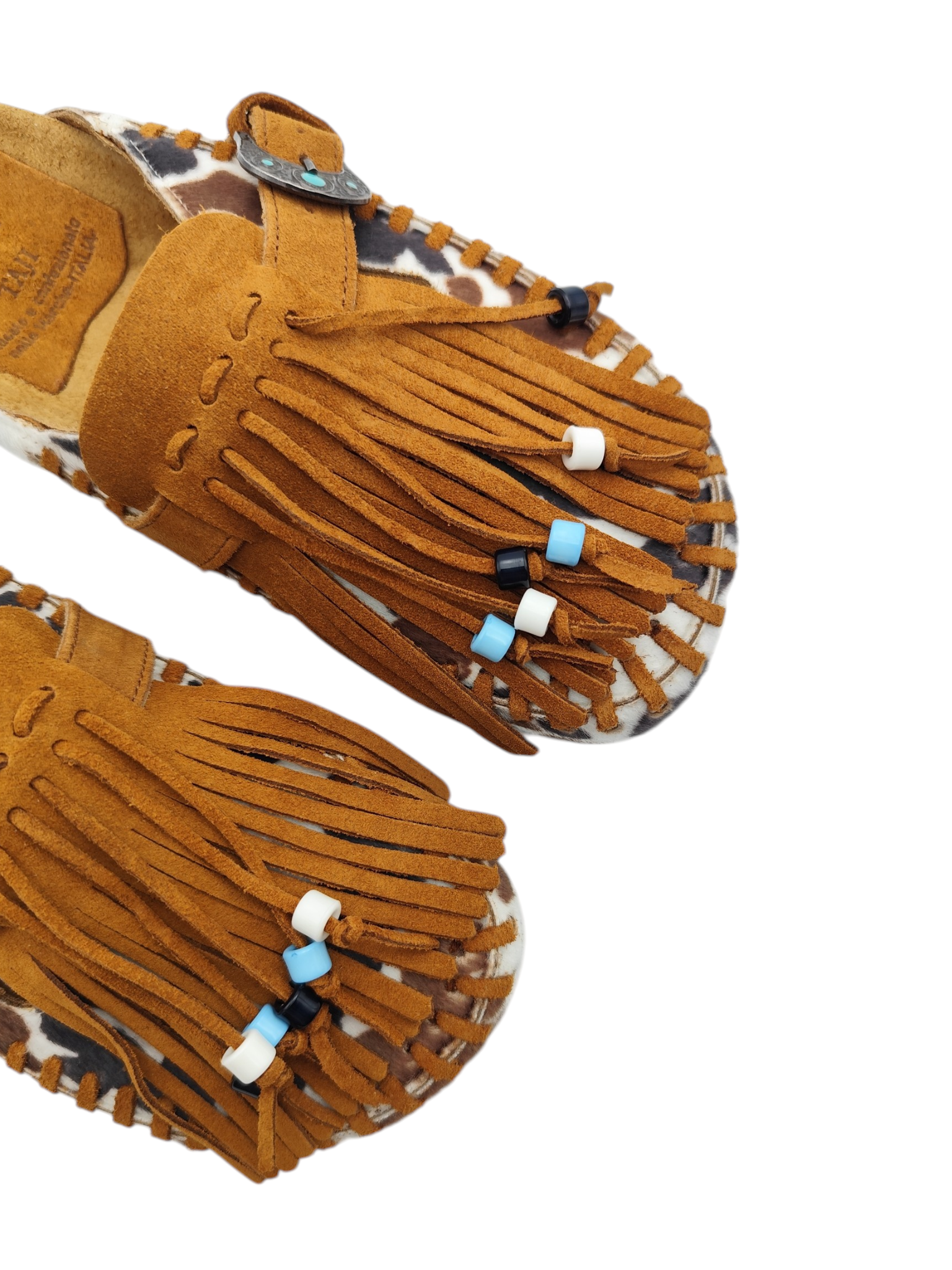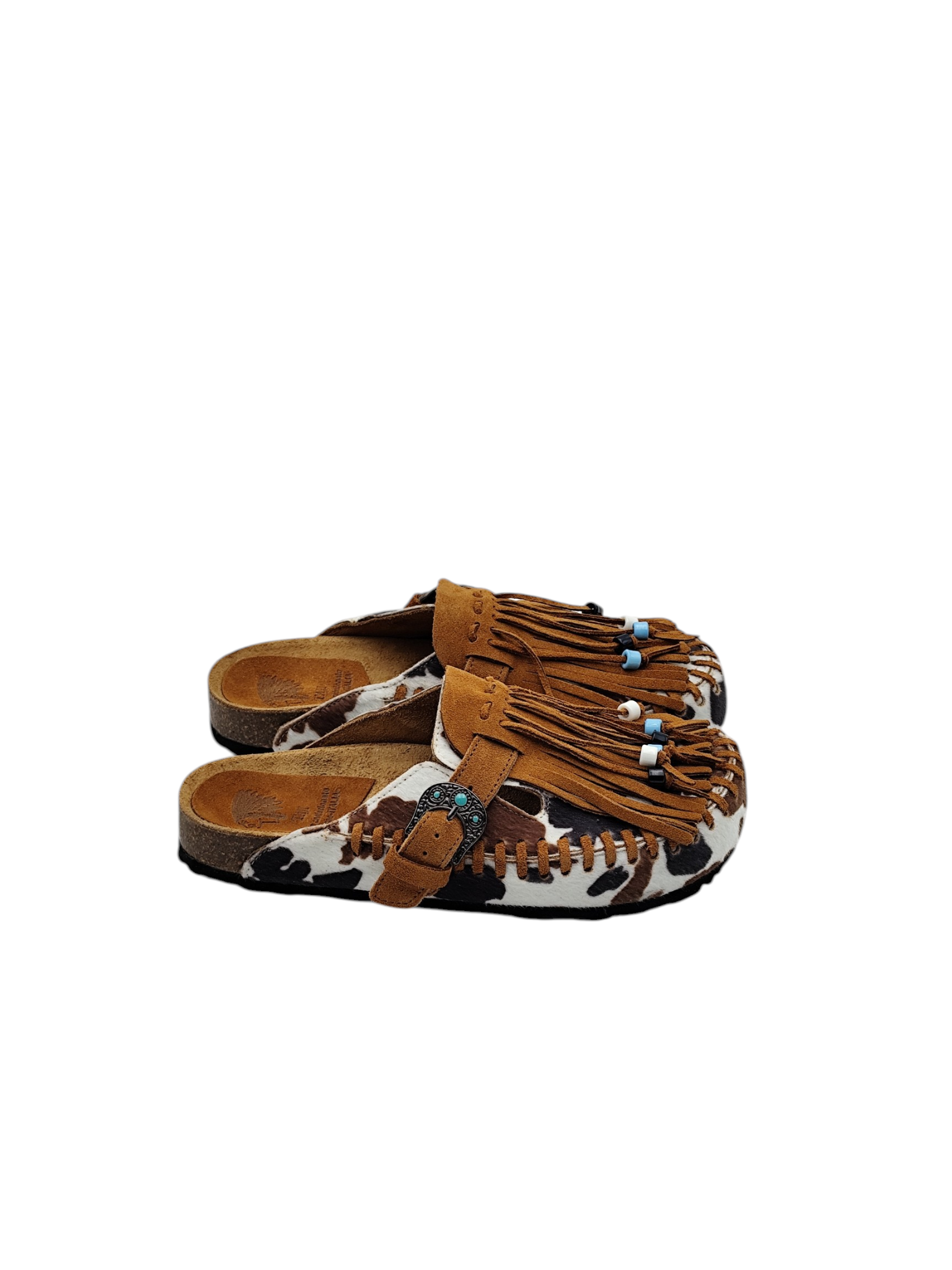 Sabot con tomaia in cavallino cow, con infilatura e frangia con perline colorate in pelle di vitello scamosciato color setter, 1 fibbia con pietre color turchese, suola anatomica foderata in crosta di vitello.