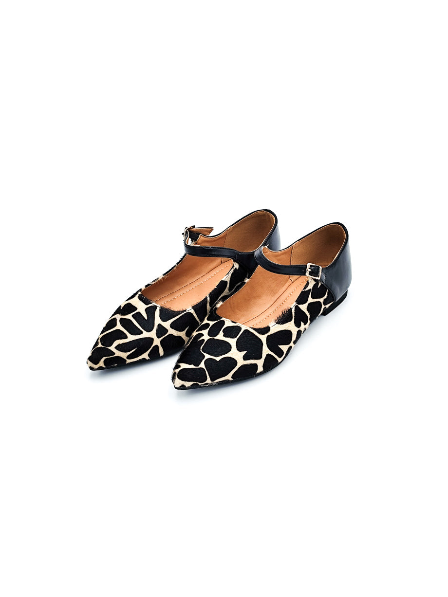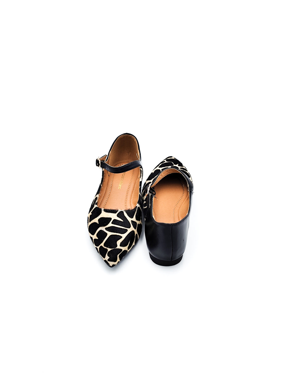 Mary Jane in tessuto effetto cavallino con fantasia giraffa e cinturino regolabile. Punta affusolata e tallone in pelle per un look raffinato e deciso.