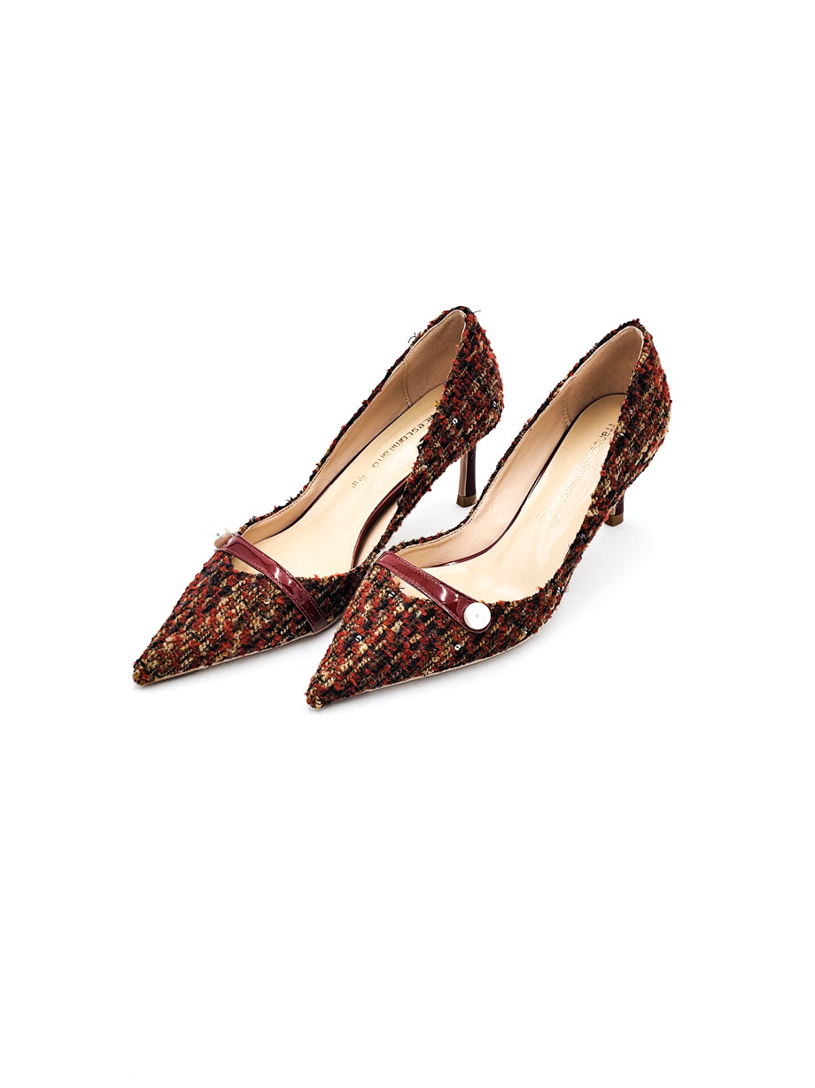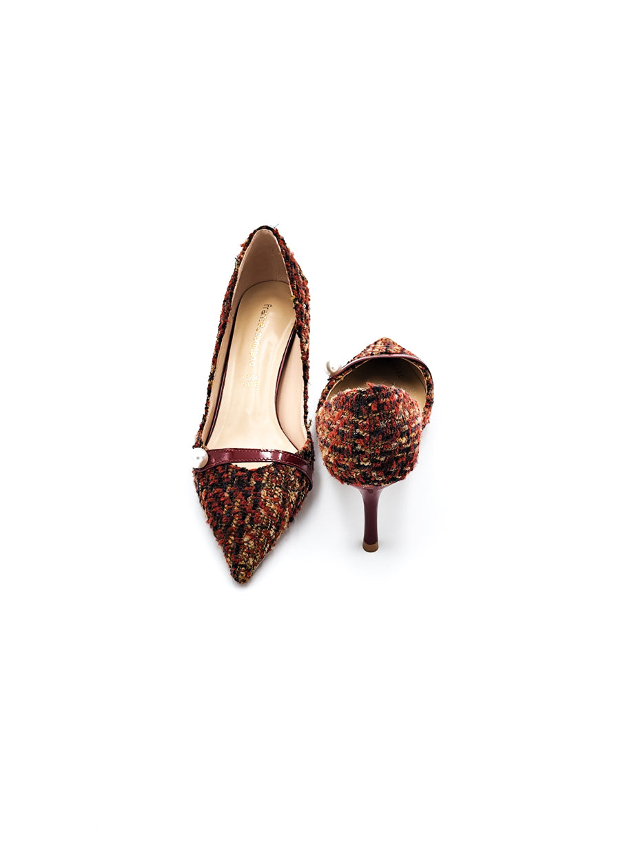Décolleté in tweed multicolor con cinturino in vernice e dettaglio perlato. Tacco medio e punta affusolata per un’eleganza contemporanea e sofisticata.