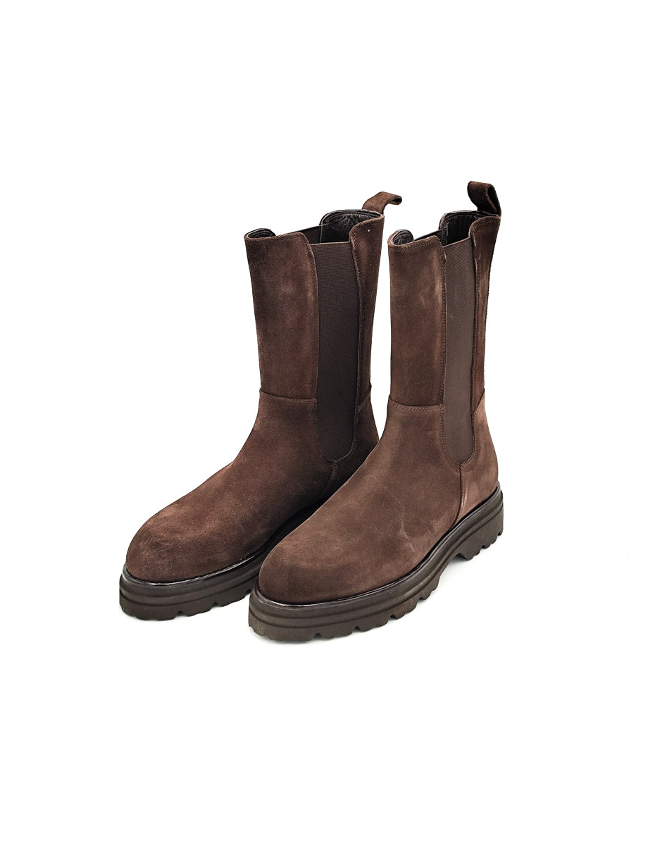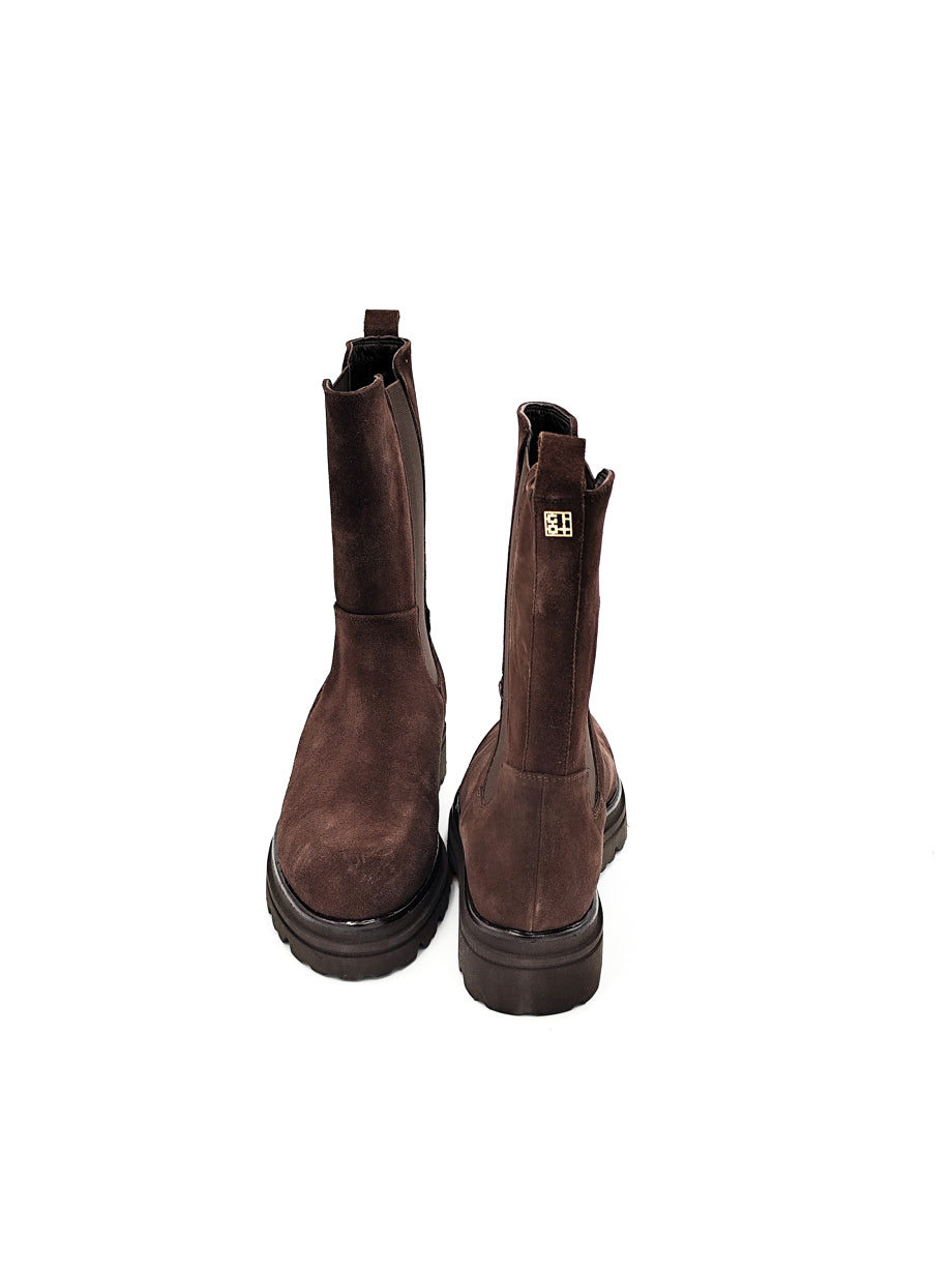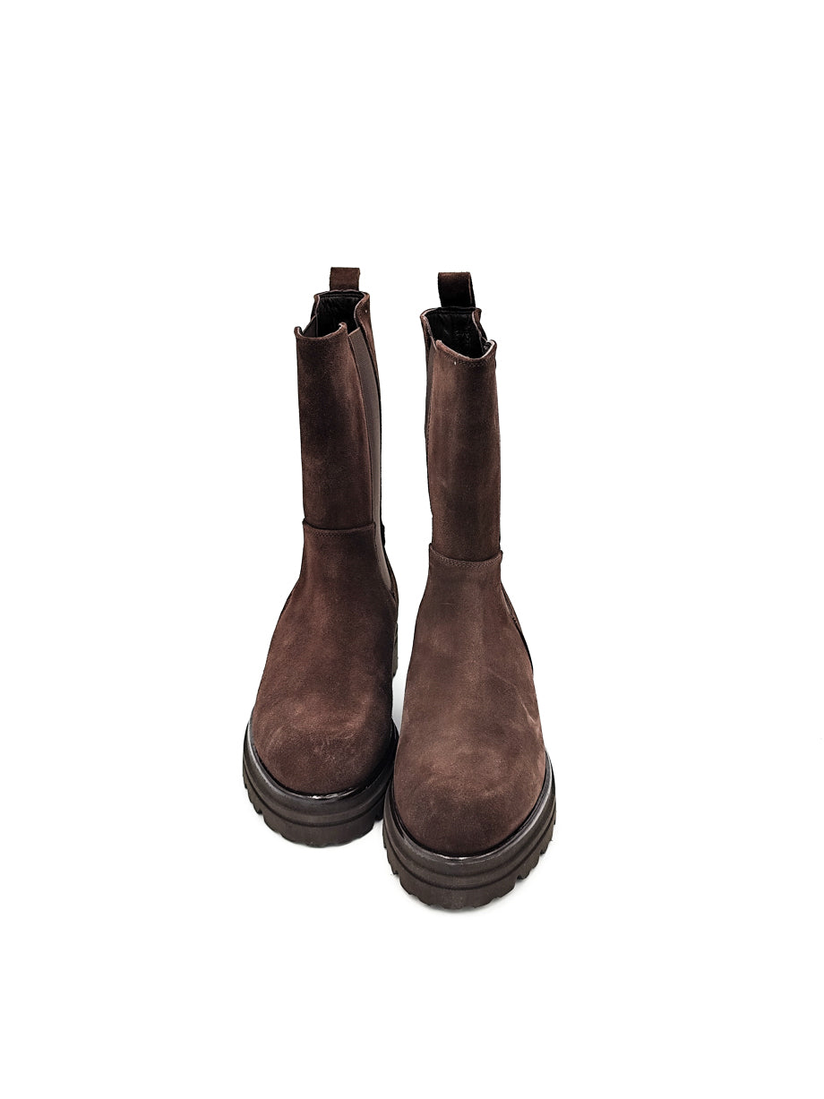 Stivaletto in suede marrone con inserti elastici e suola carrarmato. Linea pulita e comfort naturale per uno stile casual raffinato.