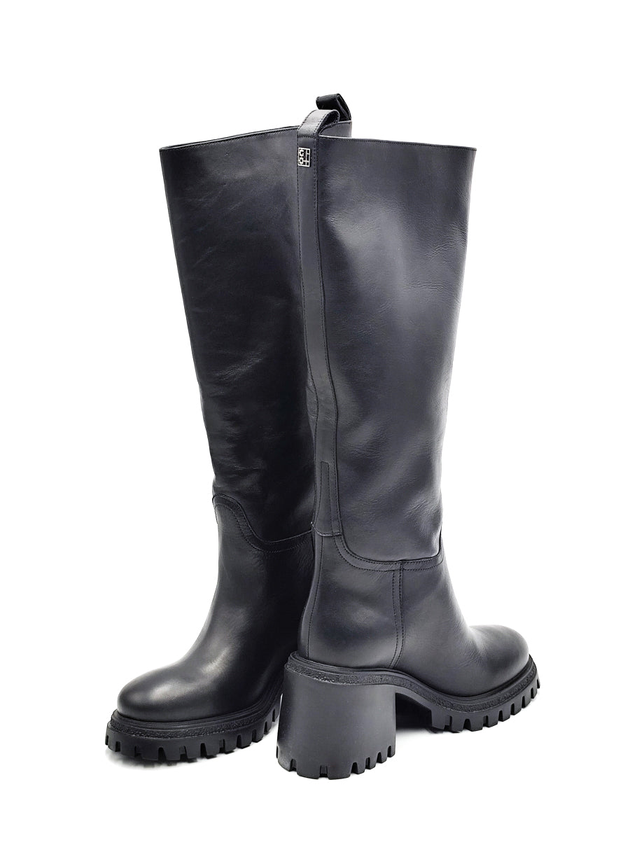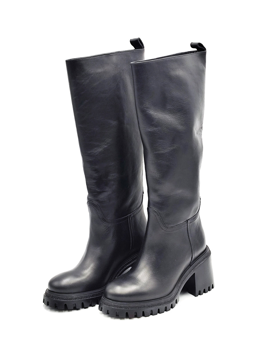 Stivale in pelle nera con tacco largo e suola carrarmato. Design deciso e femminile, perfetto per completare look di carattere.