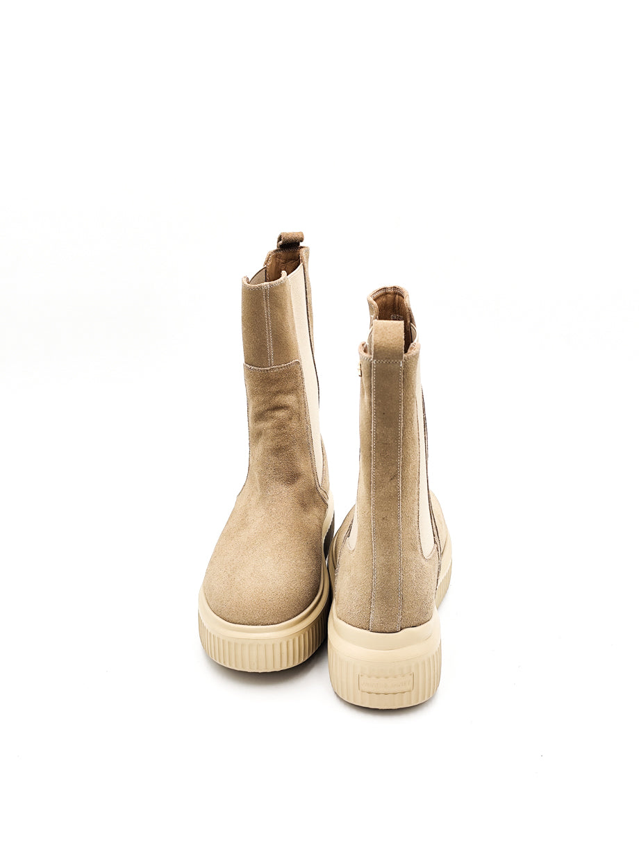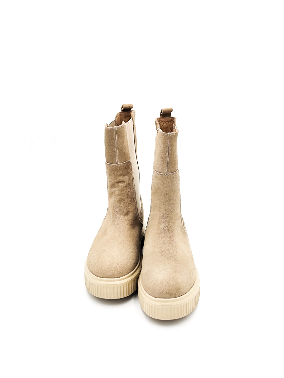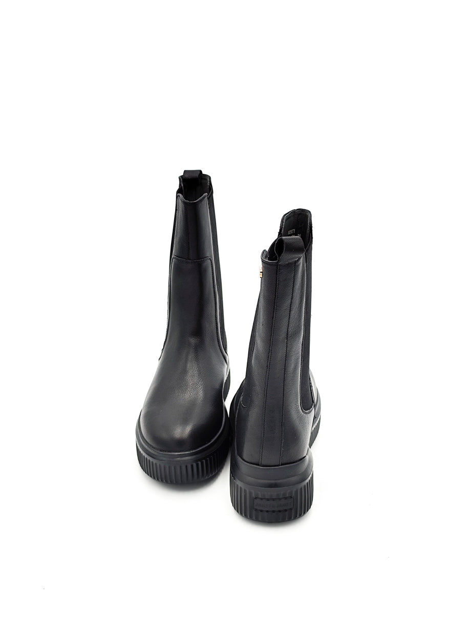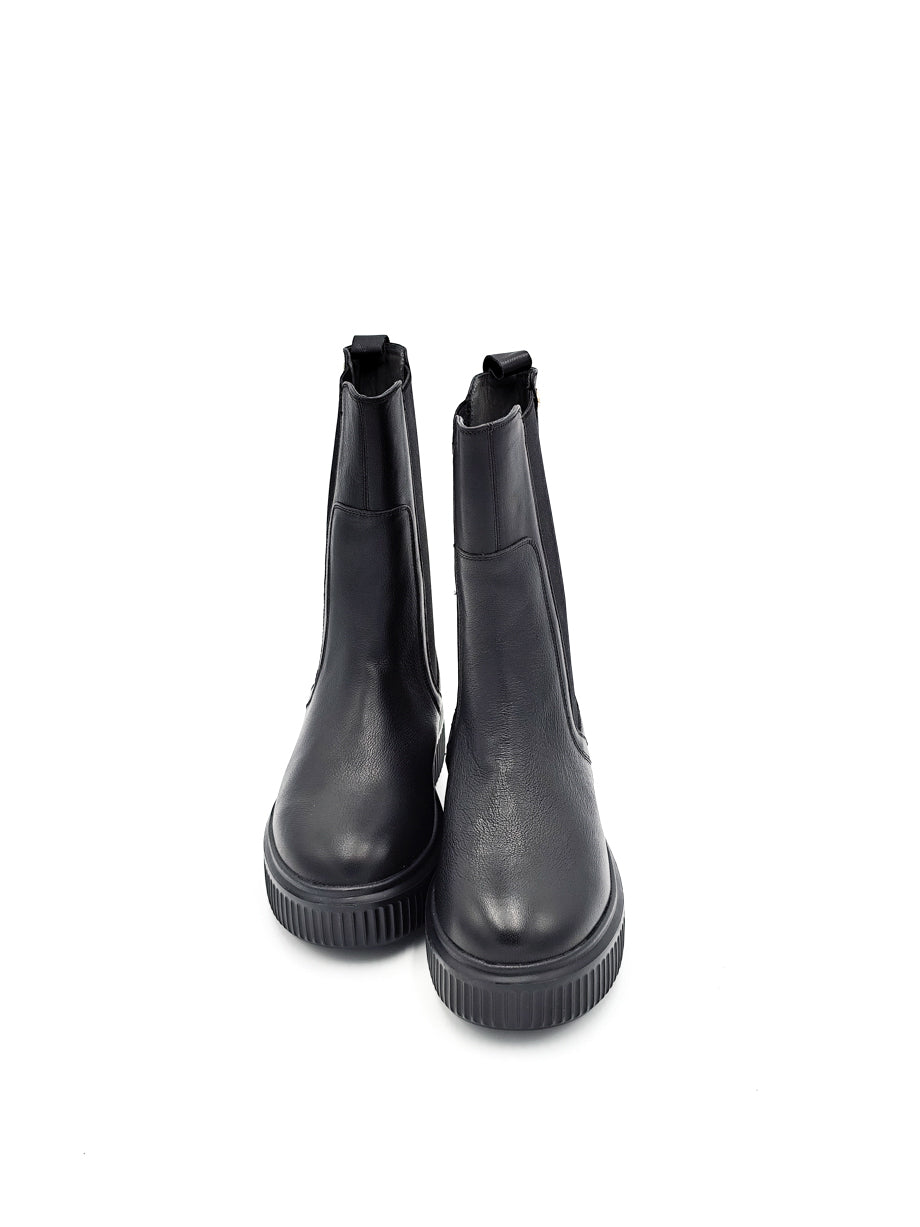Stivaletto in pelle nera con fondo platform e inserti elastici. Pratico e contemporaneo, garantisce comfort e stabilità a ogni passo.