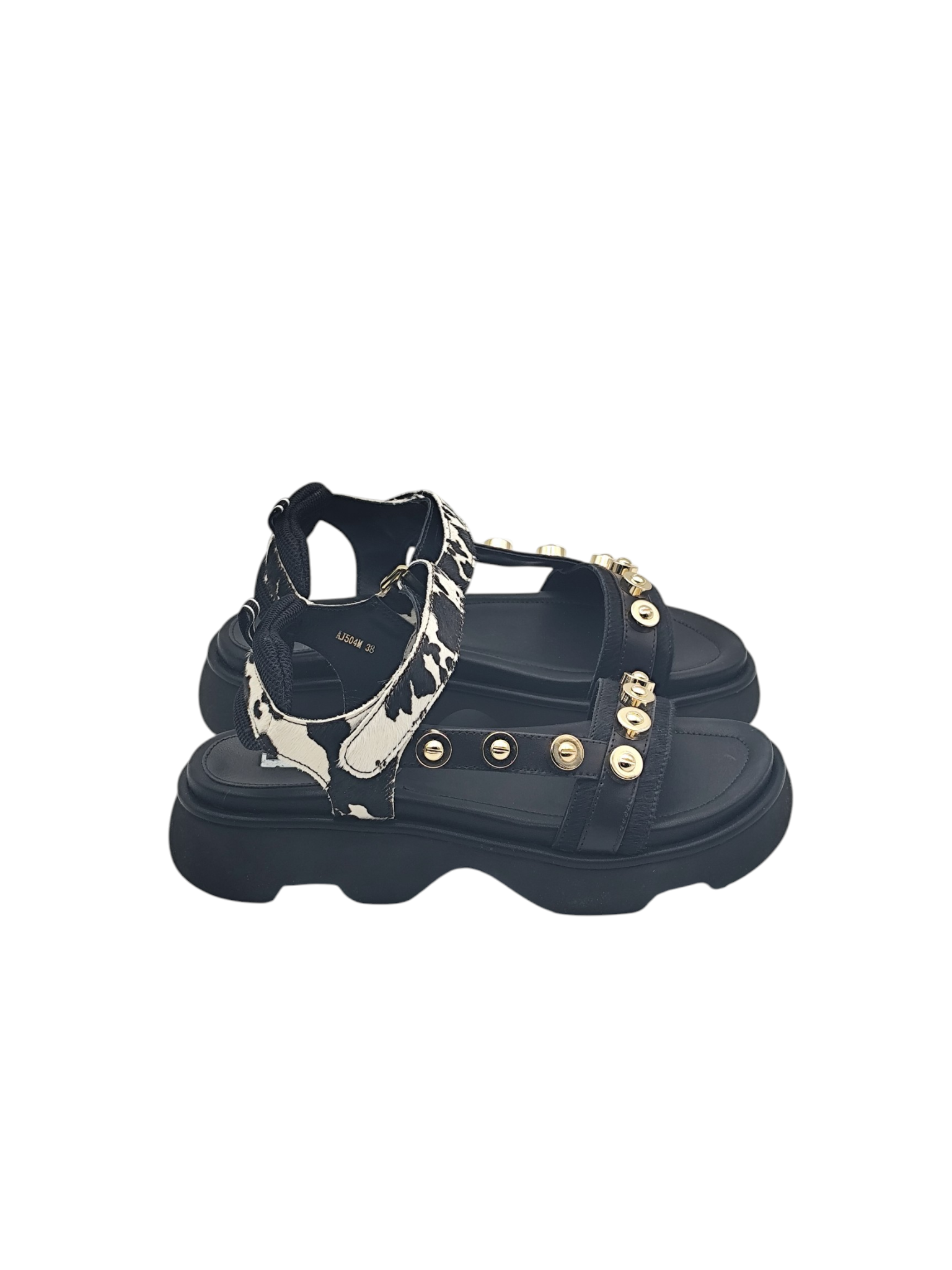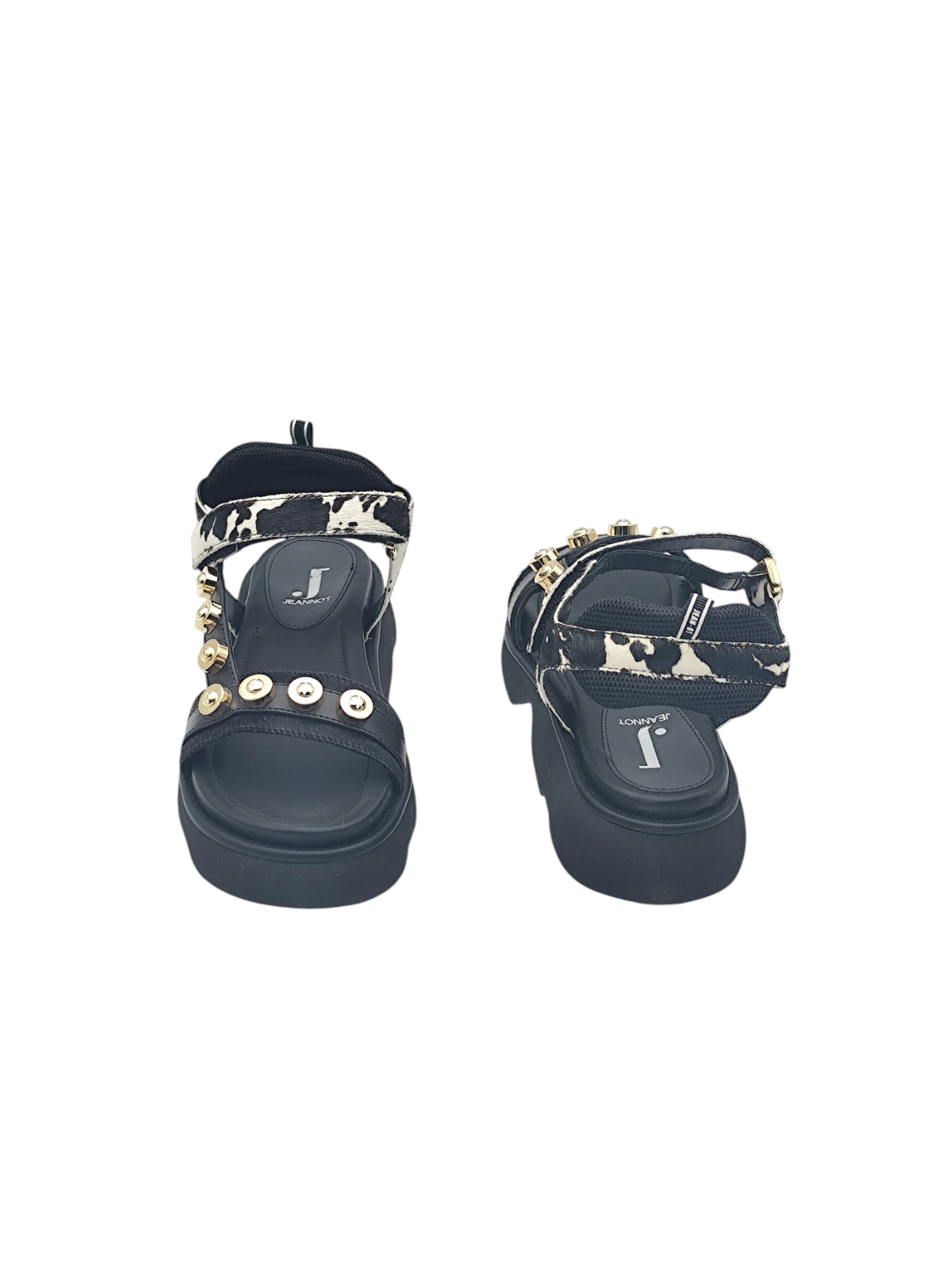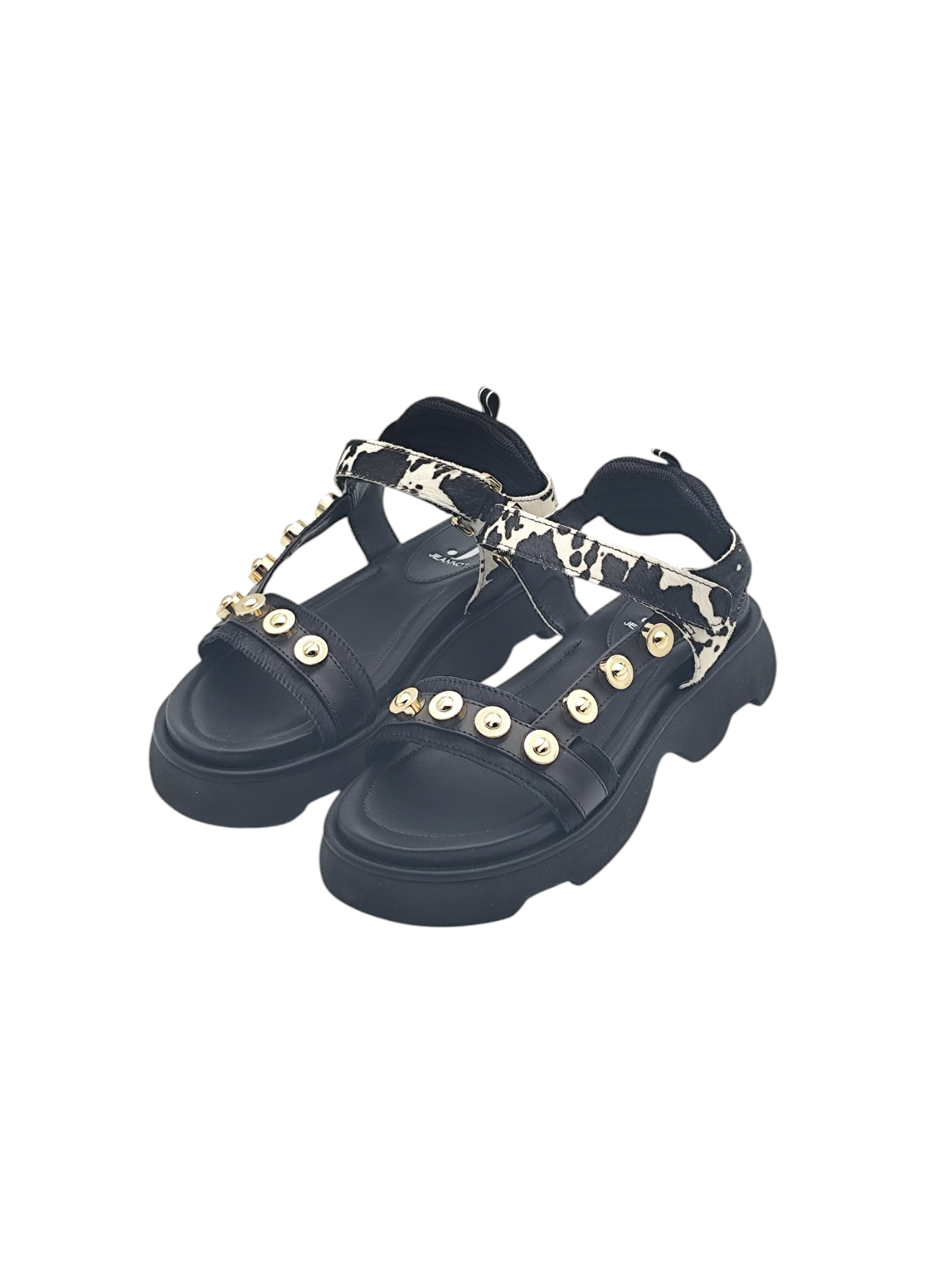 Sandalo NERO con zeppa di 4 cm, sottopiede imbottito in pelle per un appoggio del piede molto comfortevole. Le borchie oro e il cintino con lo strappo animalier effetto cavallino, rendono il sandalo molto particolare.