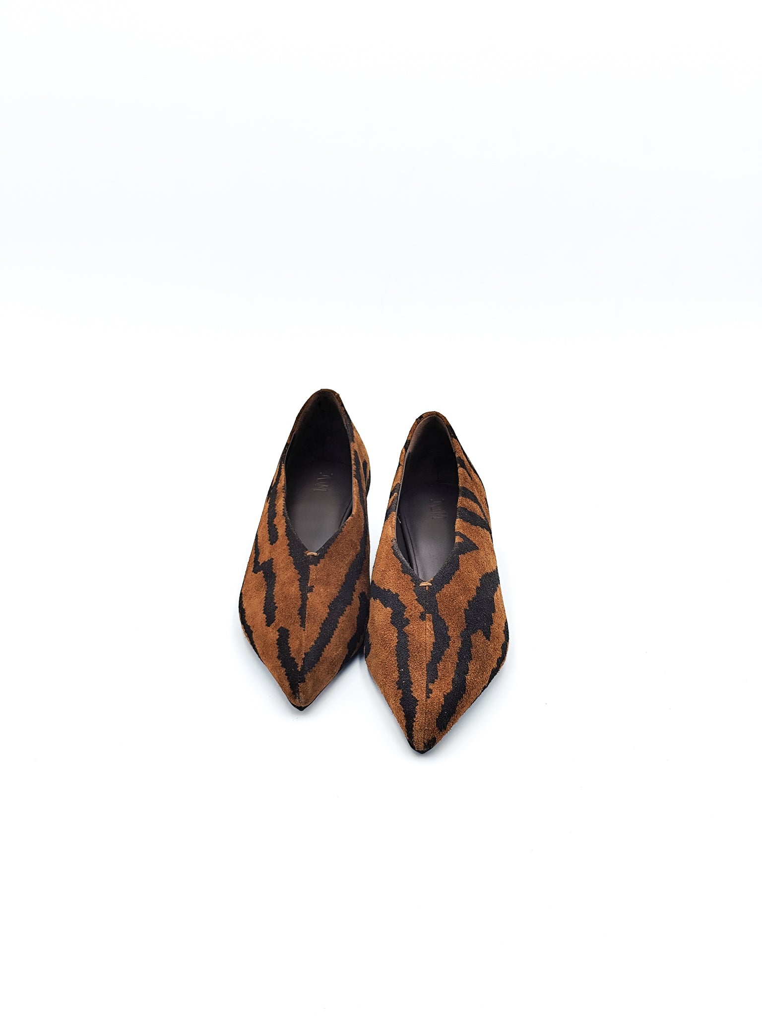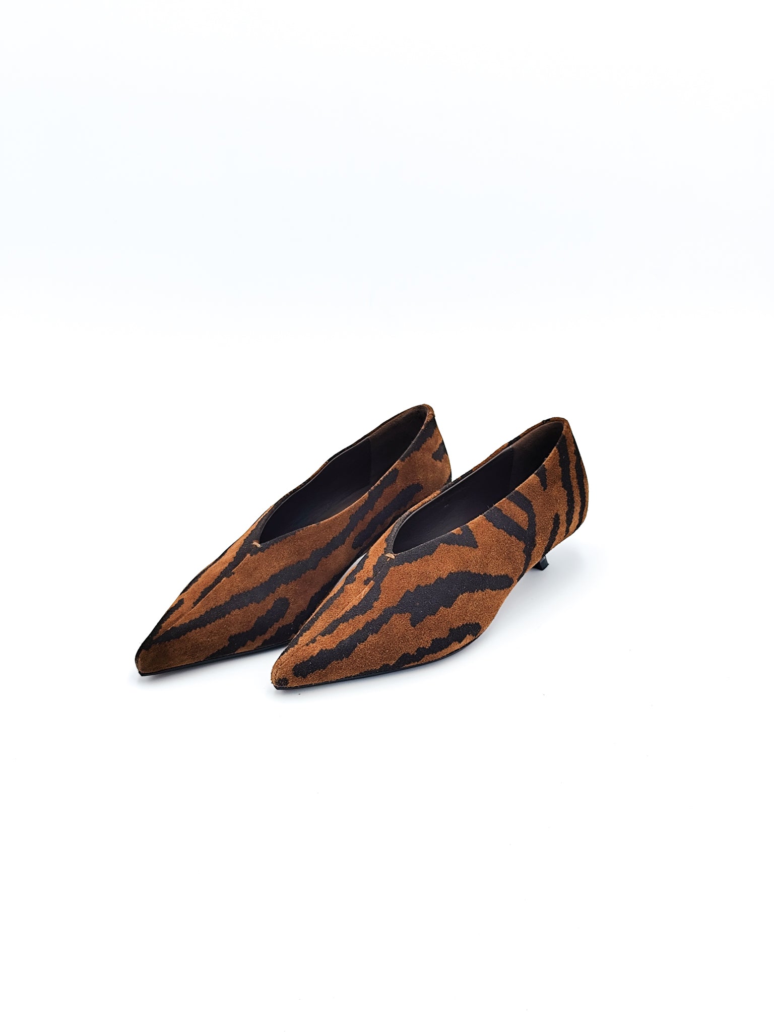 Décolleté bassa in suede con stampa tigrata. Punta affusolata, piccolo tacco e carattere audace per un’eleganza contemporanea e dinamica.
