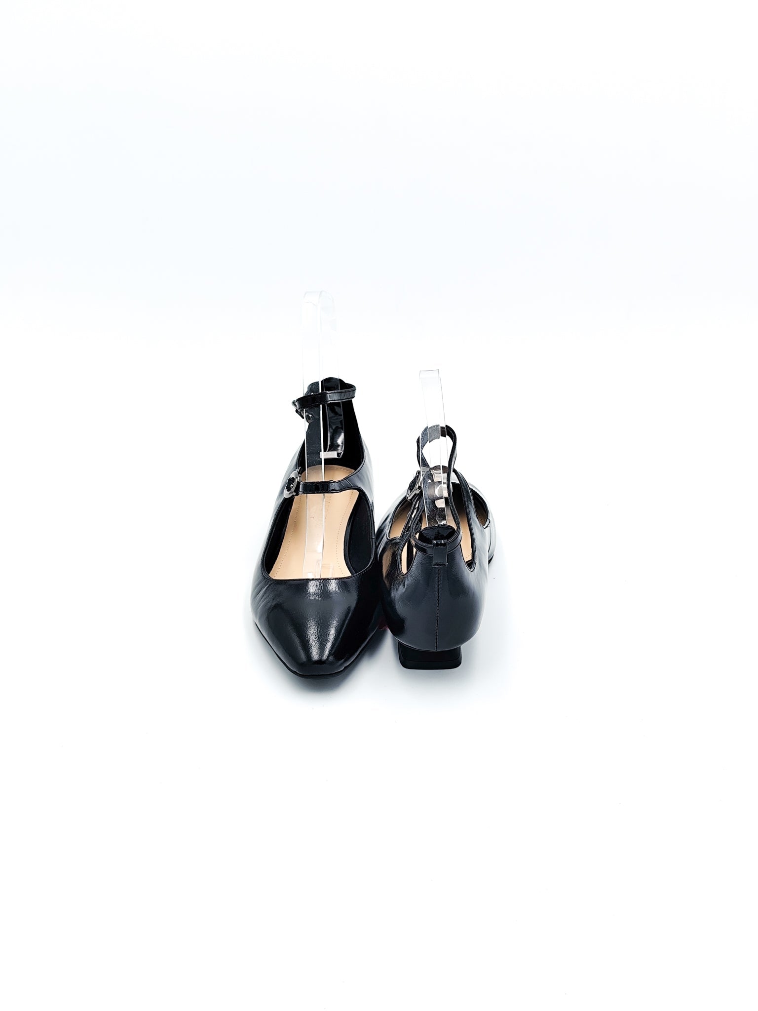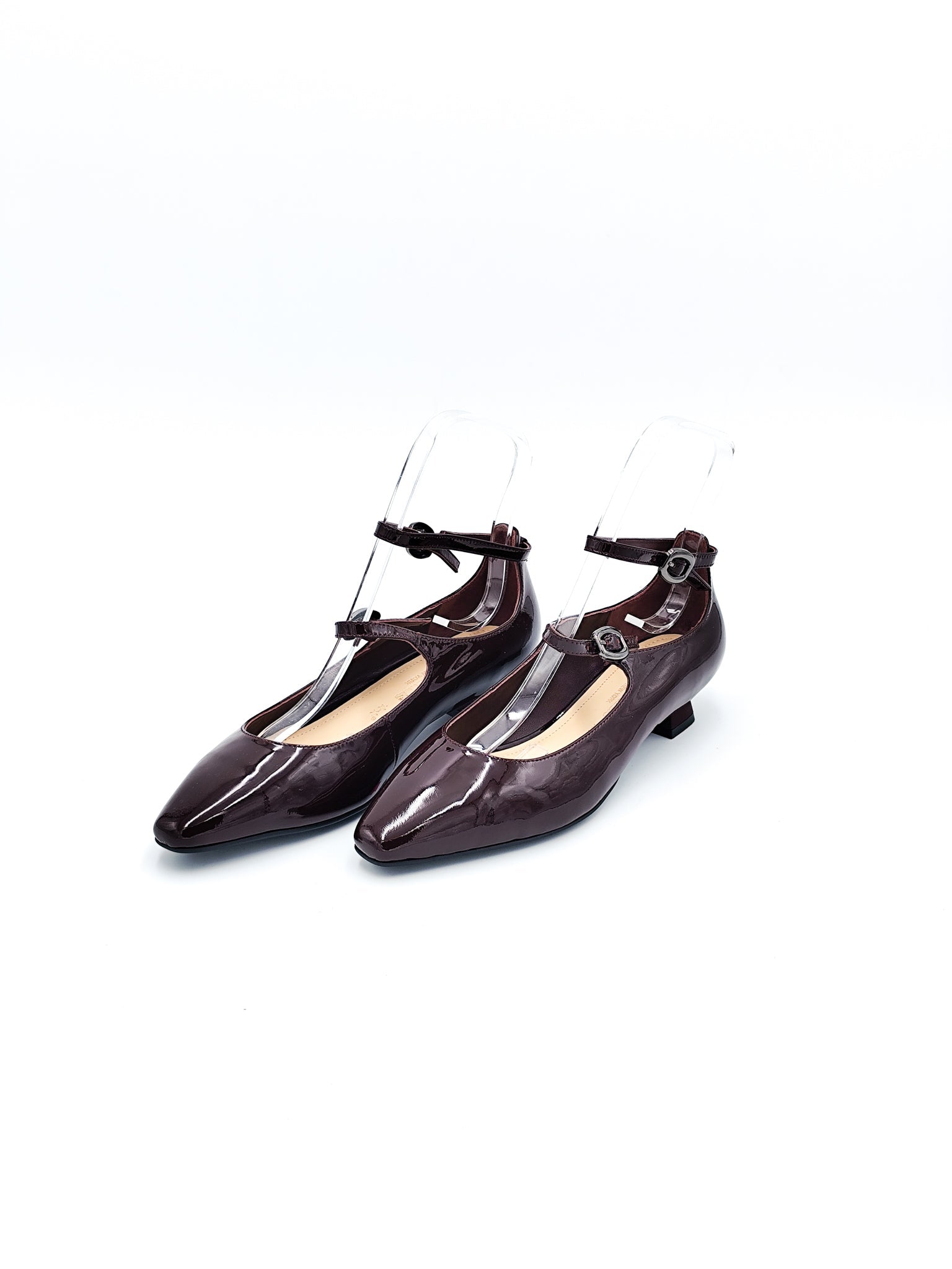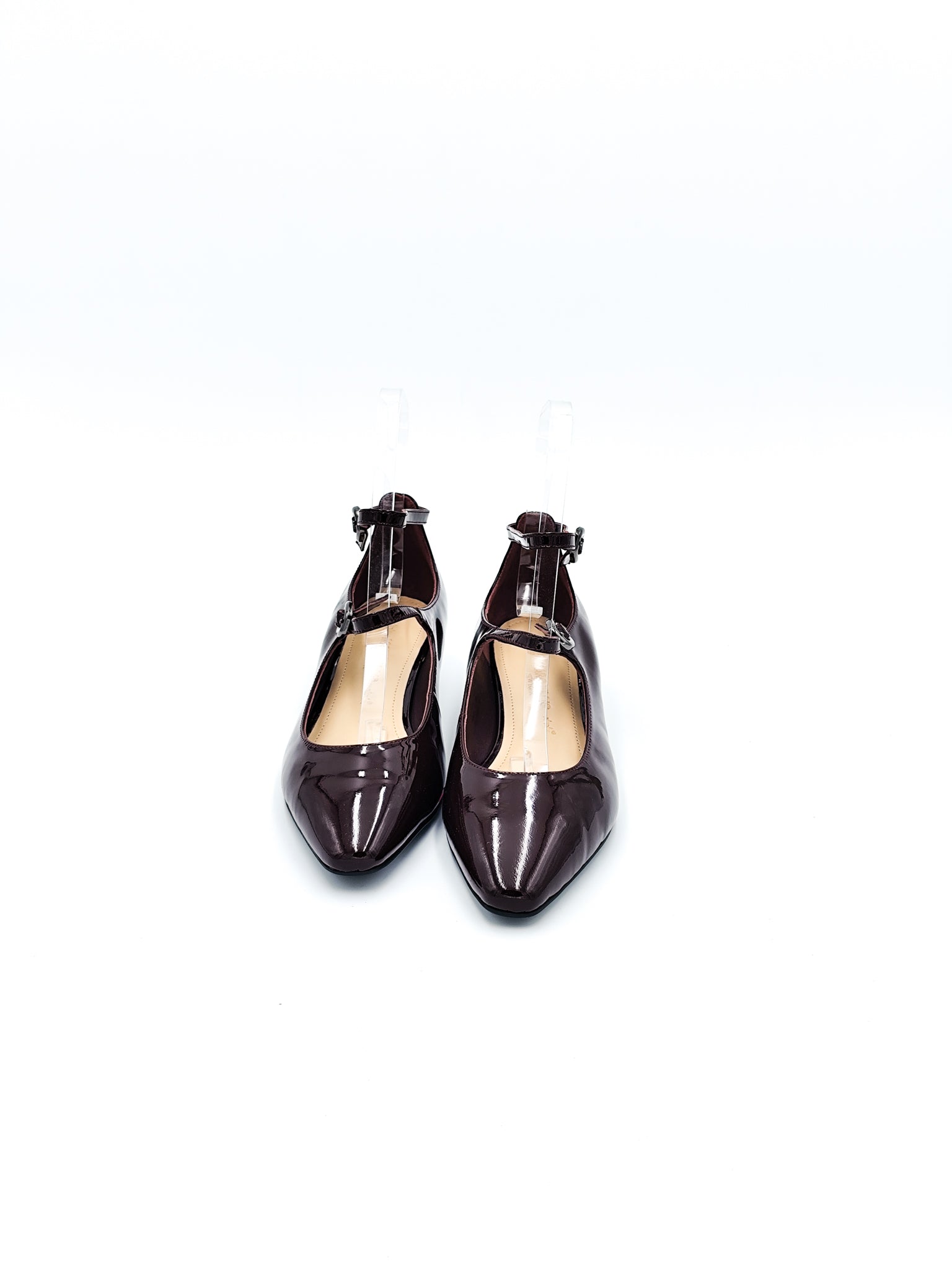 Mary Jane in vernice bordeaux con cinturino alla caviglia e tacco basso. Elegante e confortevole, perfetta per aggiungere un tocco retrò contemporaneo.