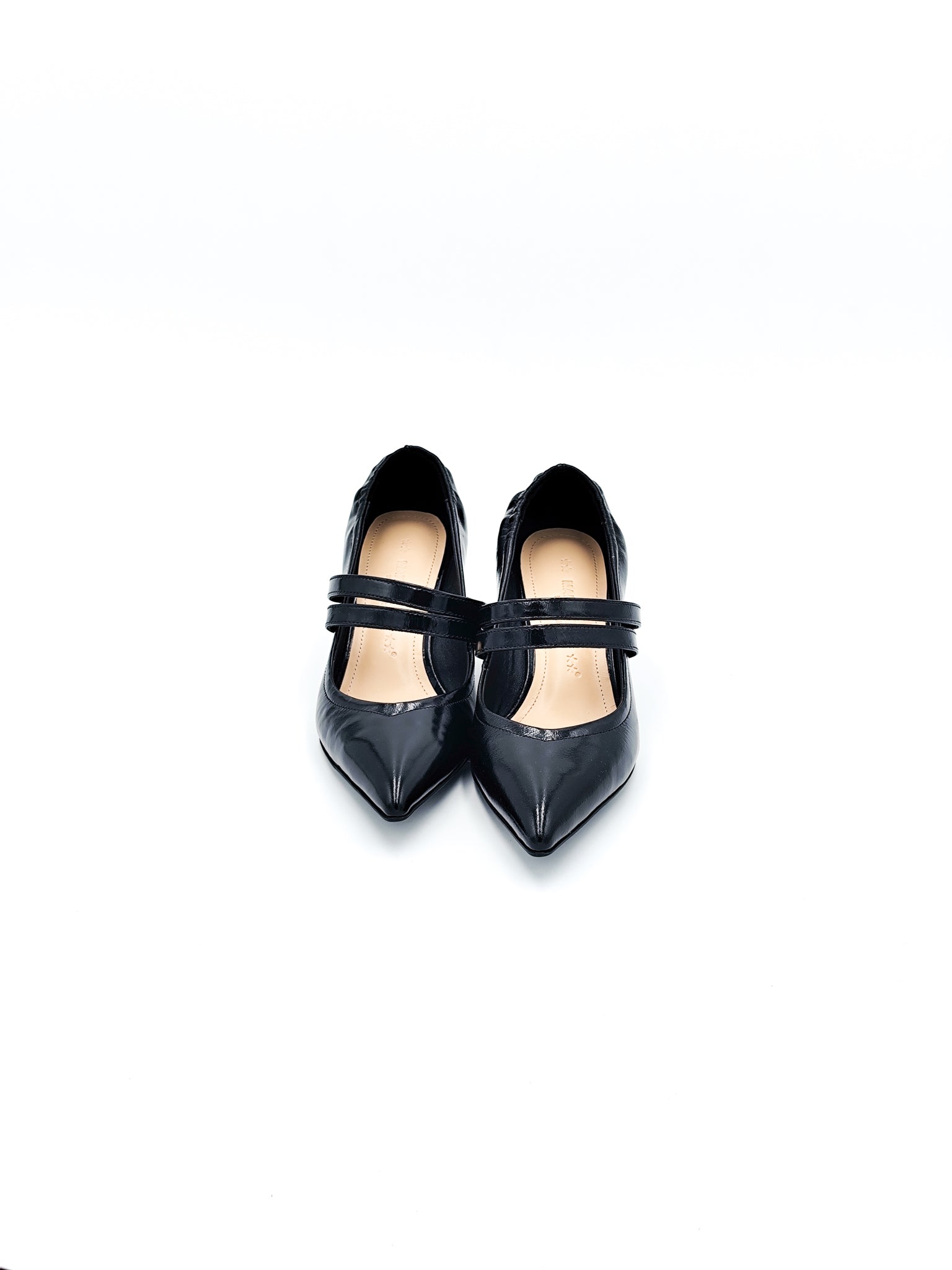 Mary Jane in pelle nera con doppio cinturino e tacco basso. Stile moderno, calzata stabile e perfetta per completare ogni look quotidiano.