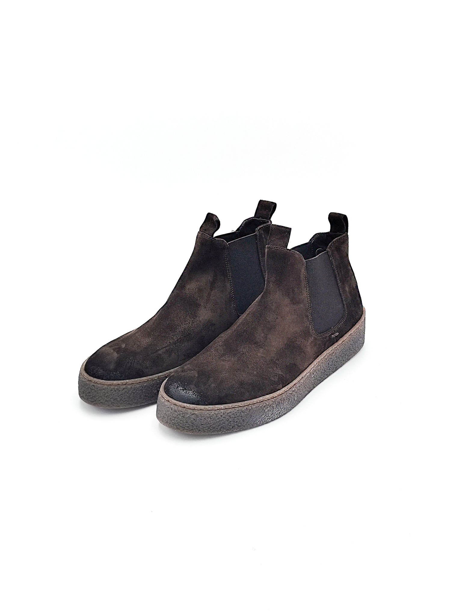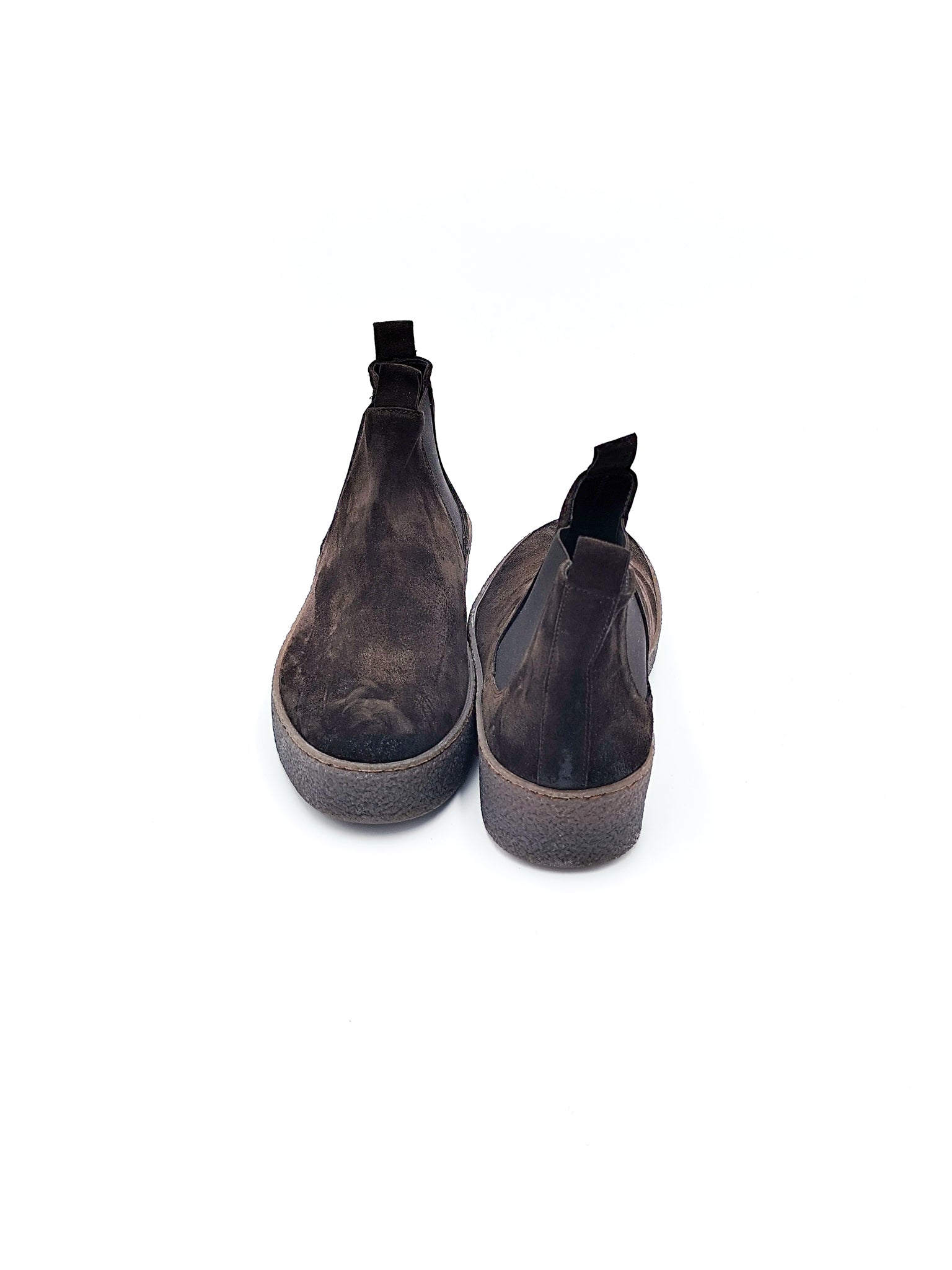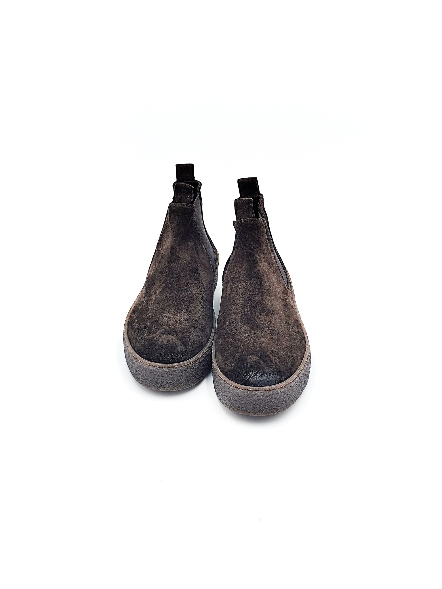 Stivaletto Chelsea in suede marrone con elastici laterali. Fondo in gomma e design essenziale per un comfort quotidiano dal fascino intramontabile.