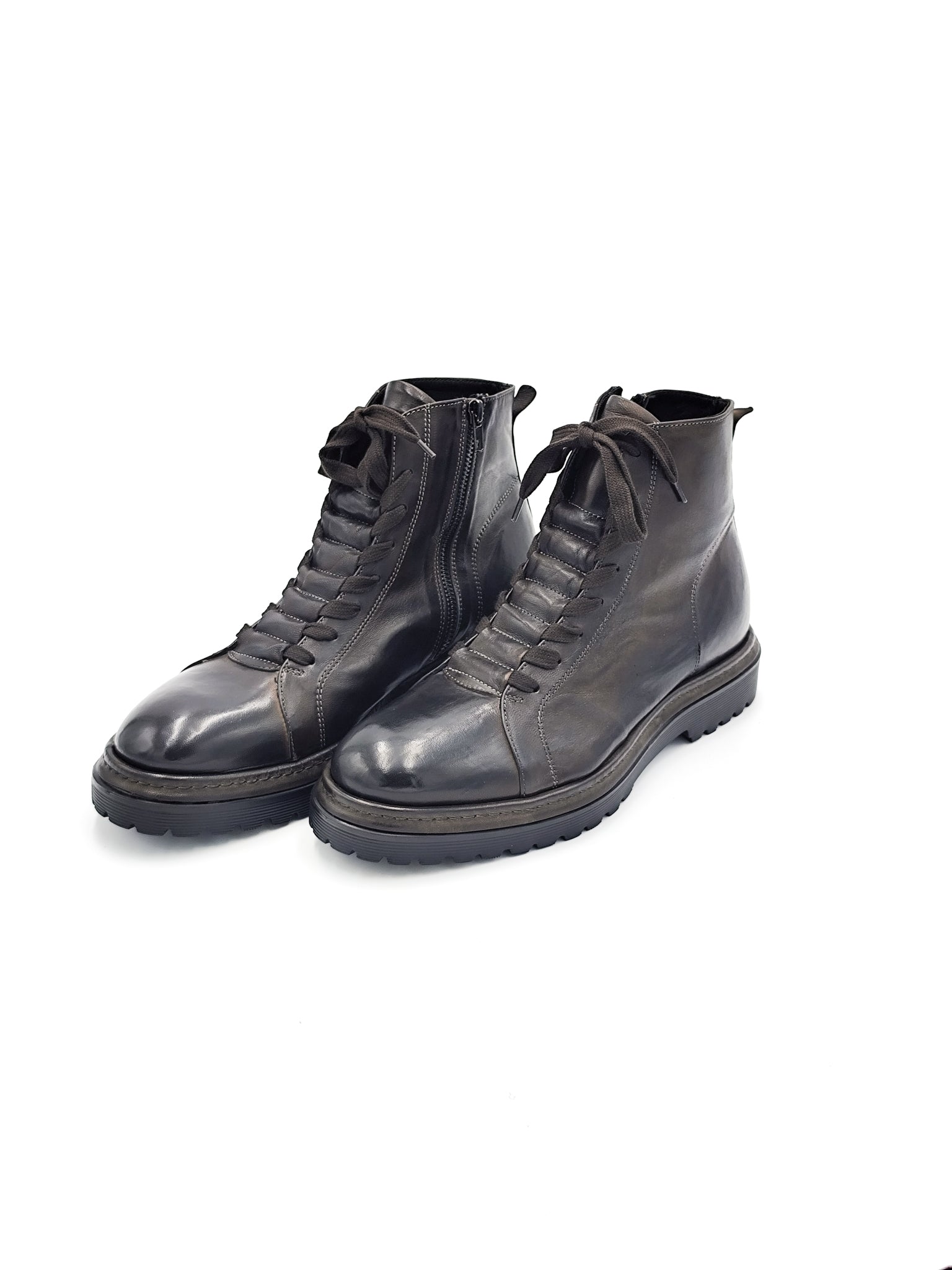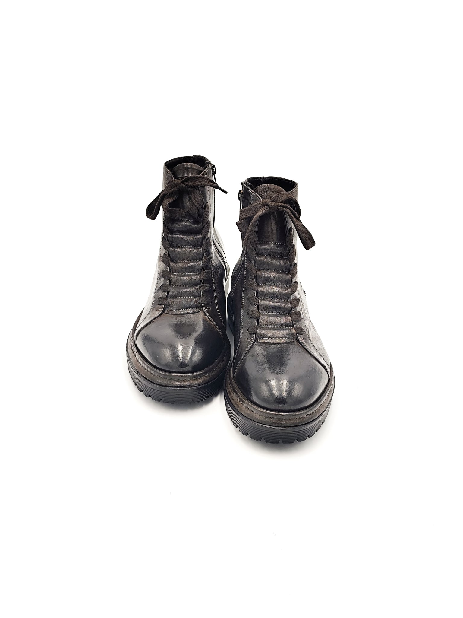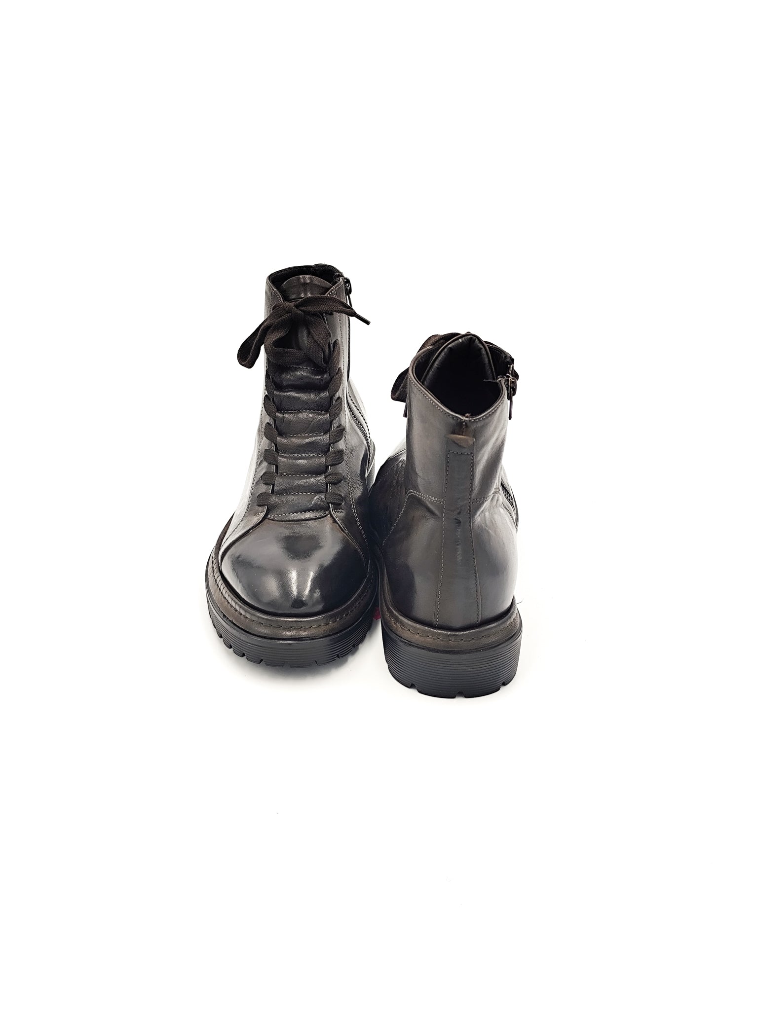 Anfibio in pelle marrone con chiusura a lacci e zip laterale. Suola robusta e linea grintosa per un look moderno e deciso.