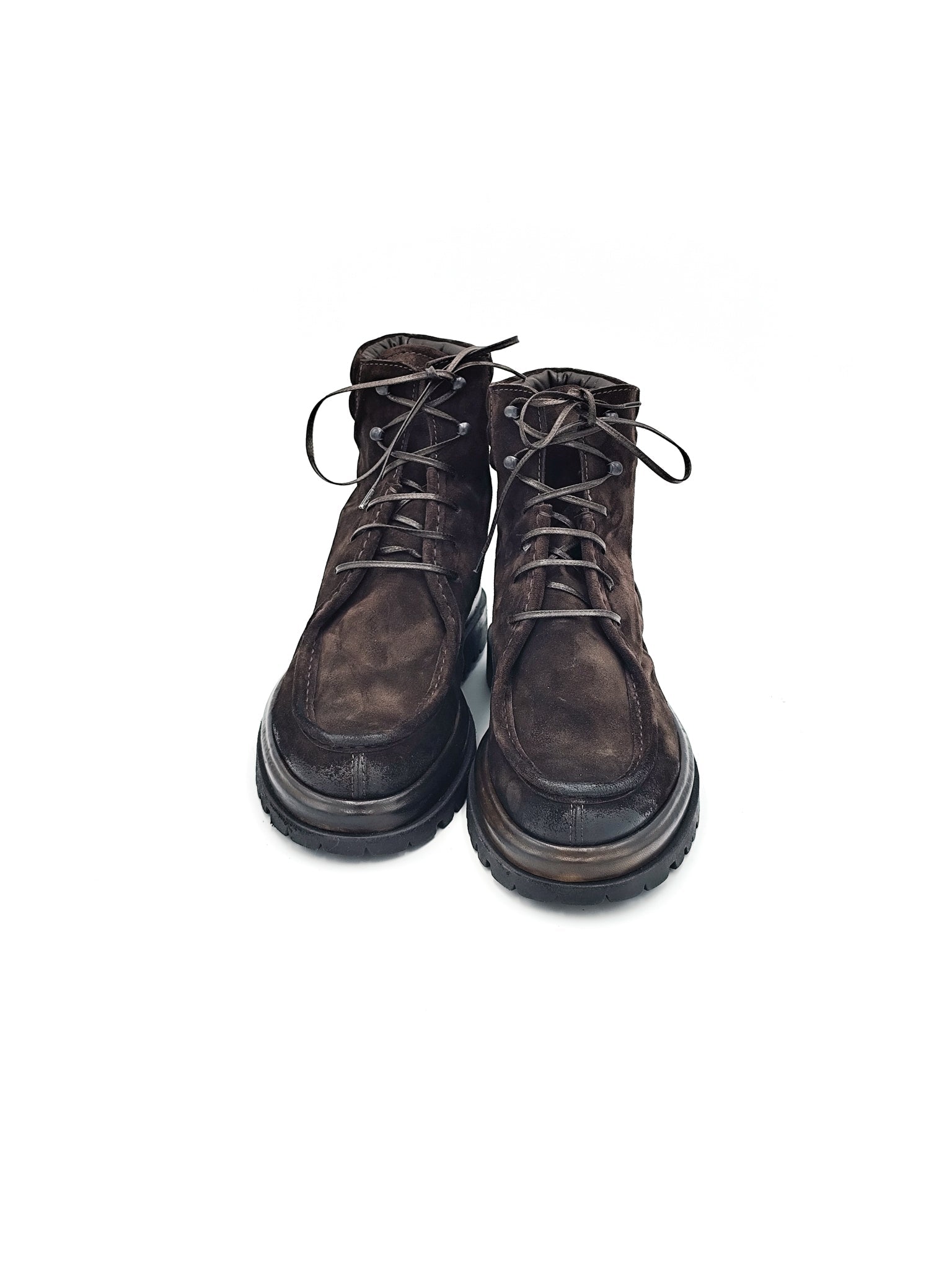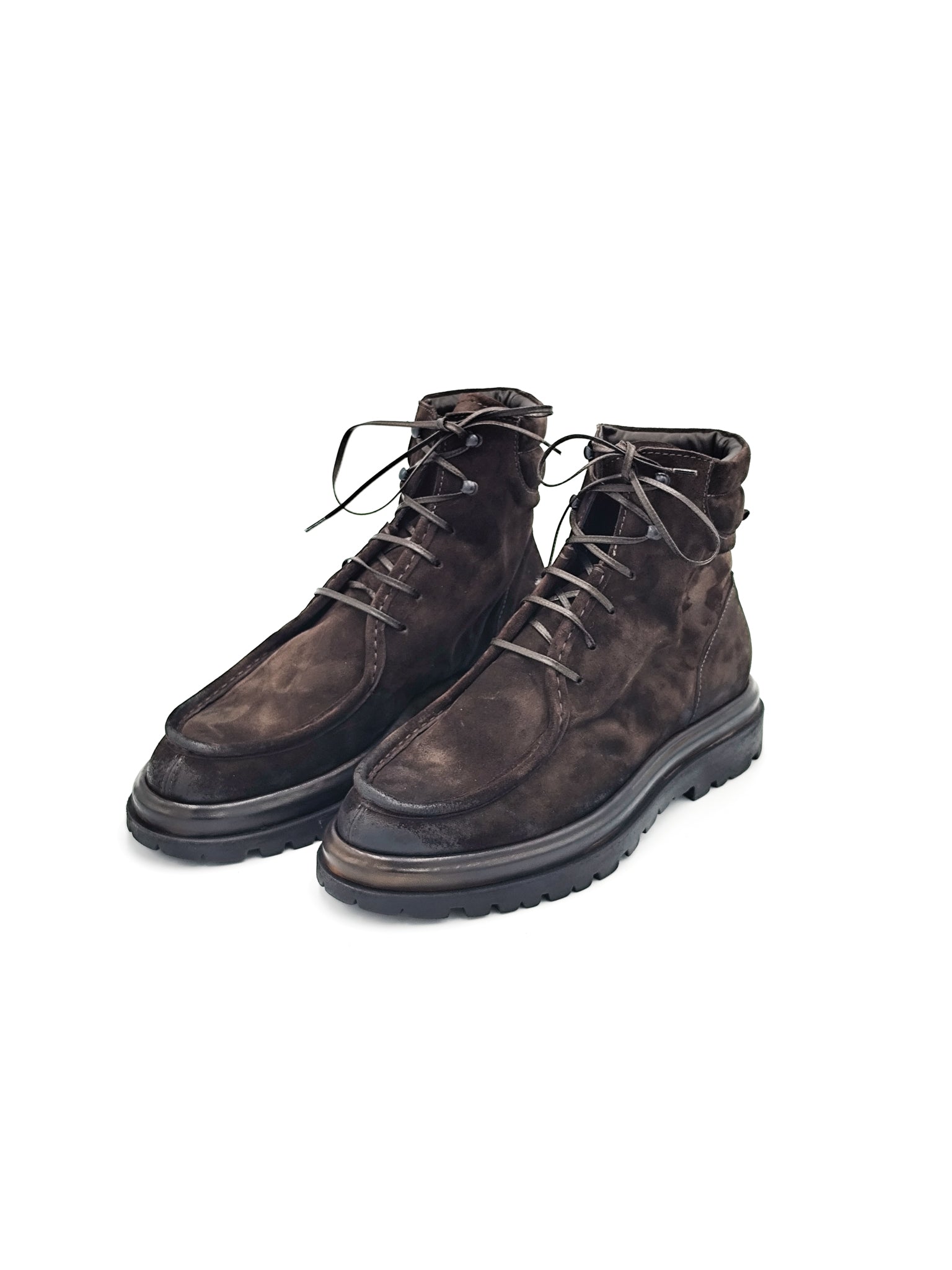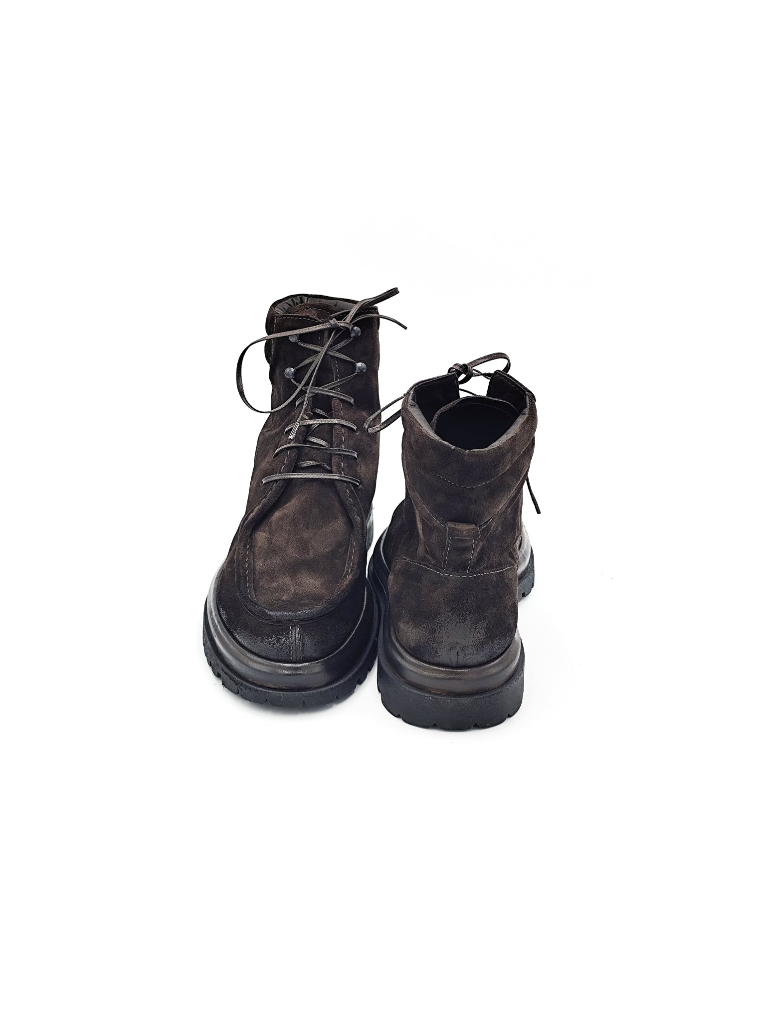 Anfibio in camoscio marrone con suola spessa e cuciture a rilievo. Calzata comoda e stile contemporaneo per affrontare la stagione con personalità.