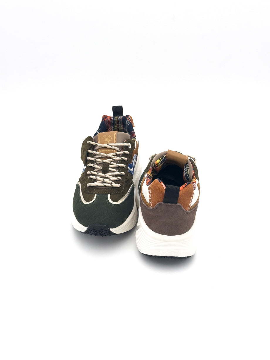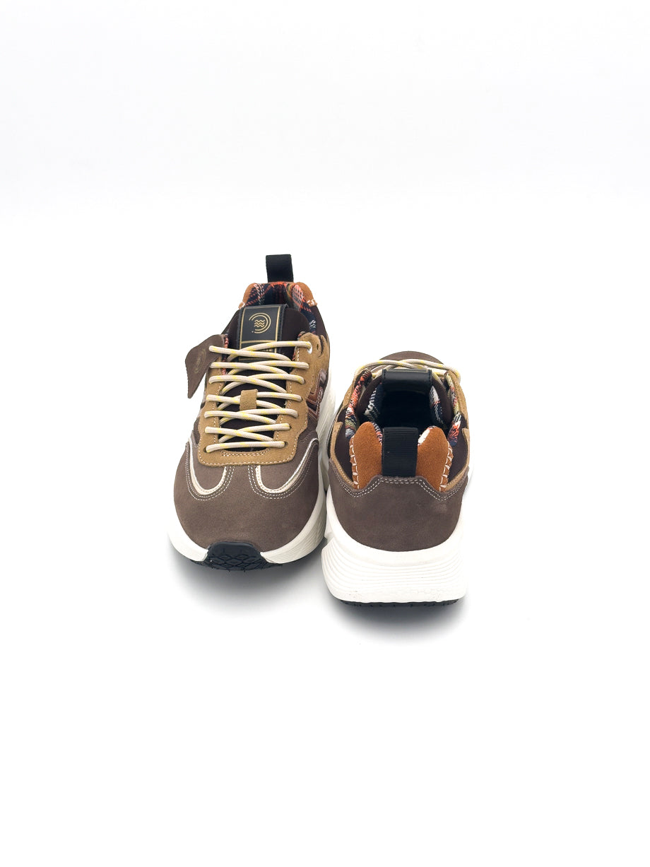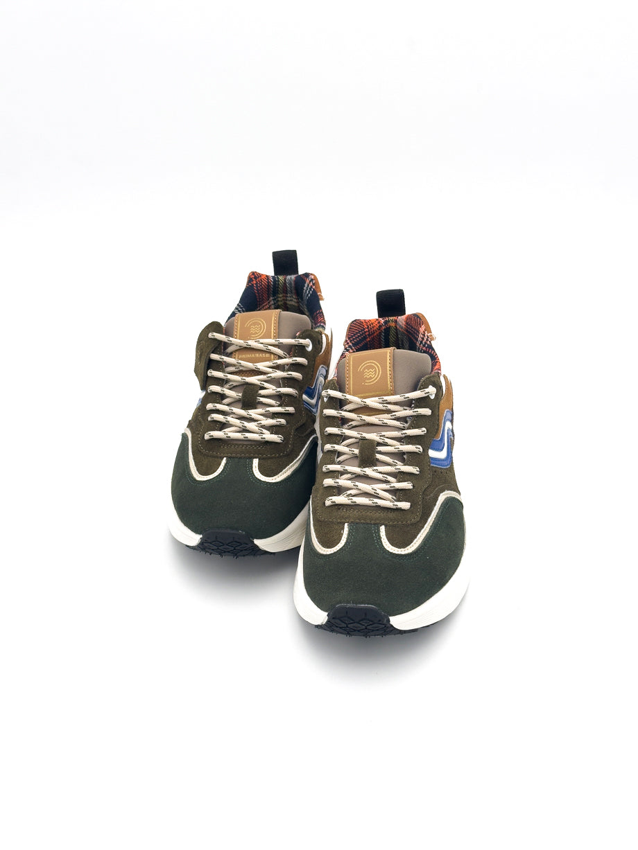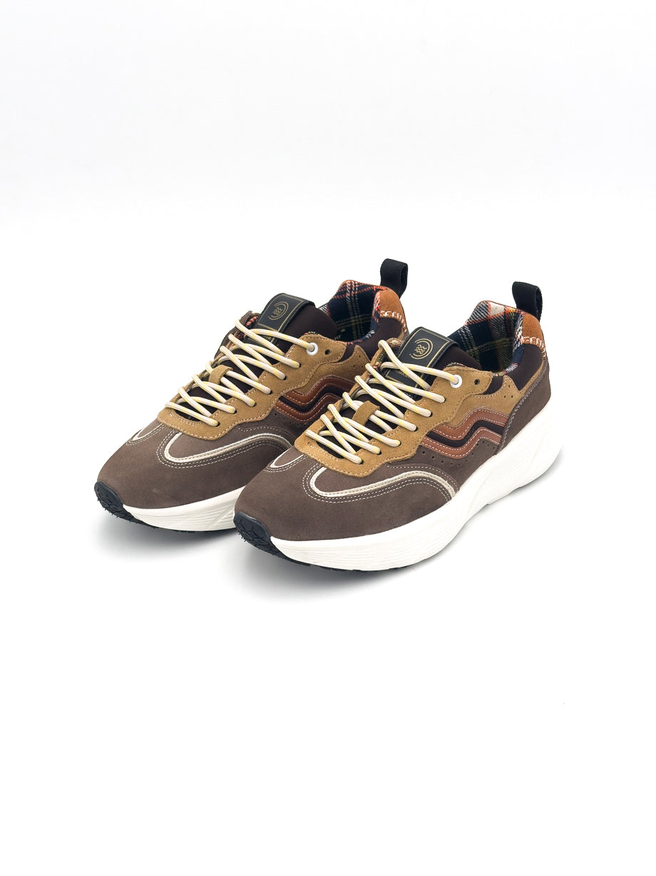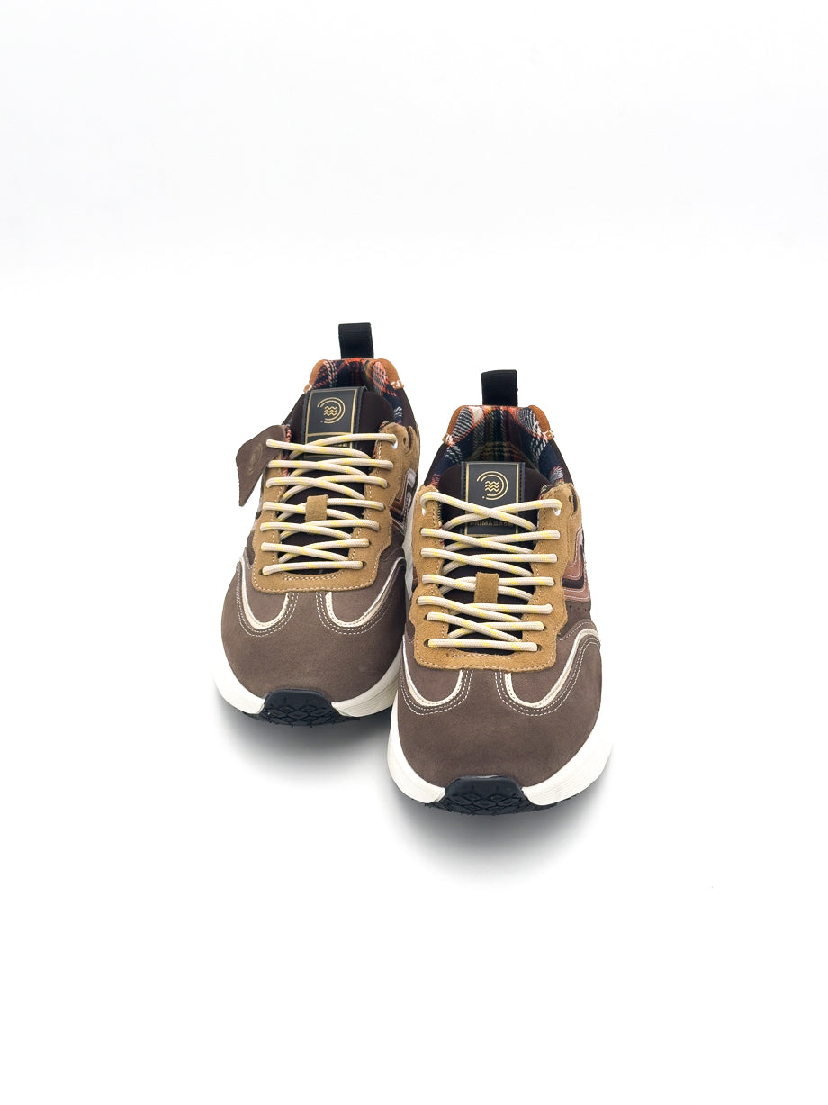 Sneaker in suede e tessuto tecnico, dal look moderno e naturale. Suola leggera in gomma, comfort ottimale e fodera interna a fantasia scozzese.