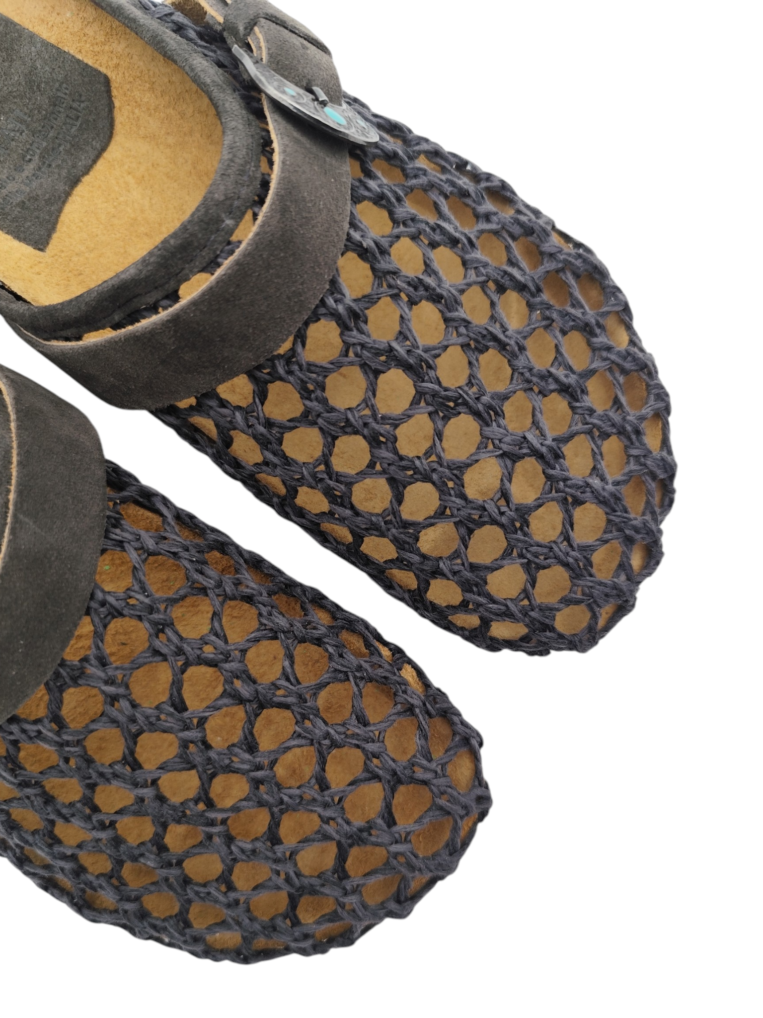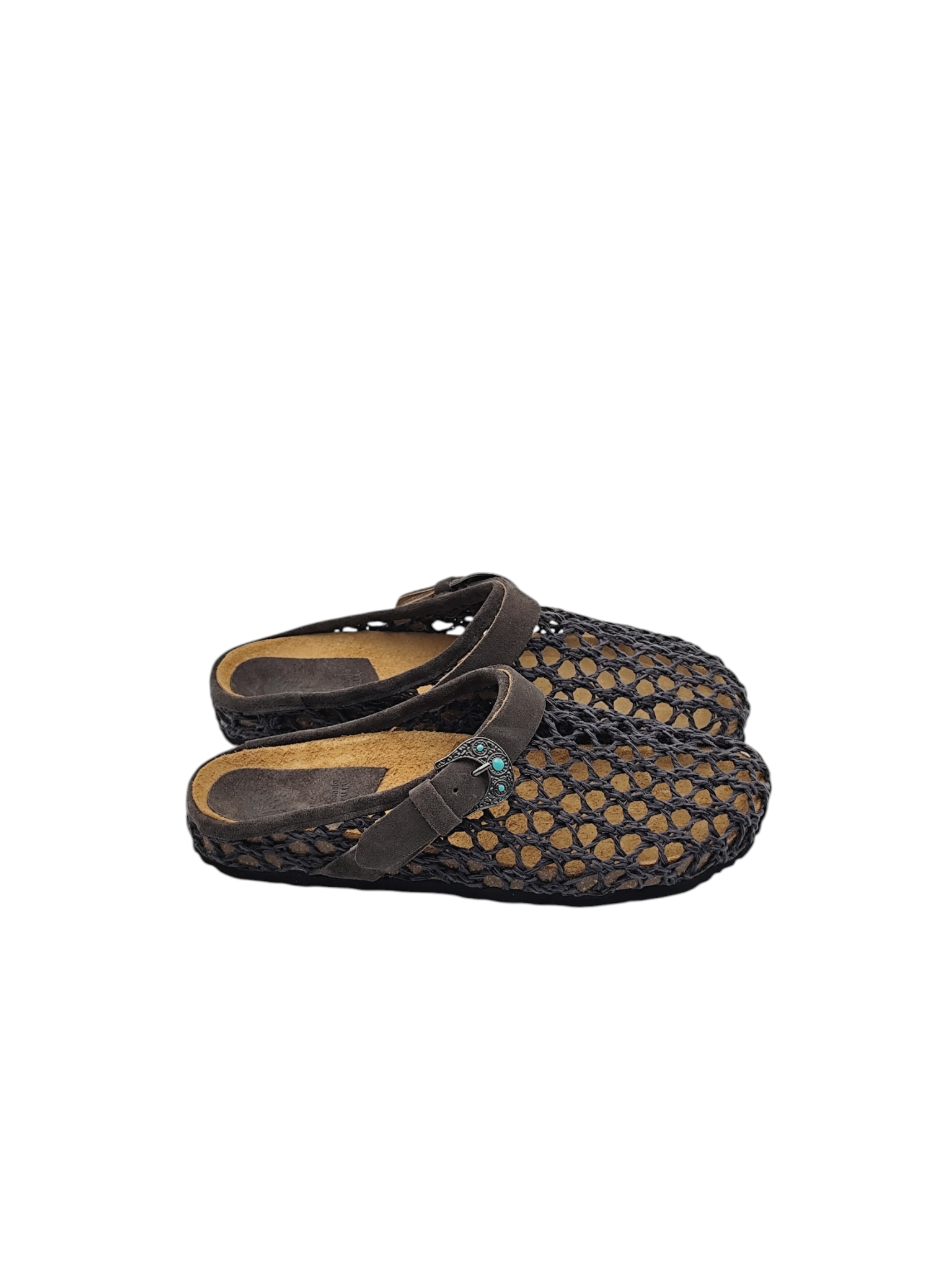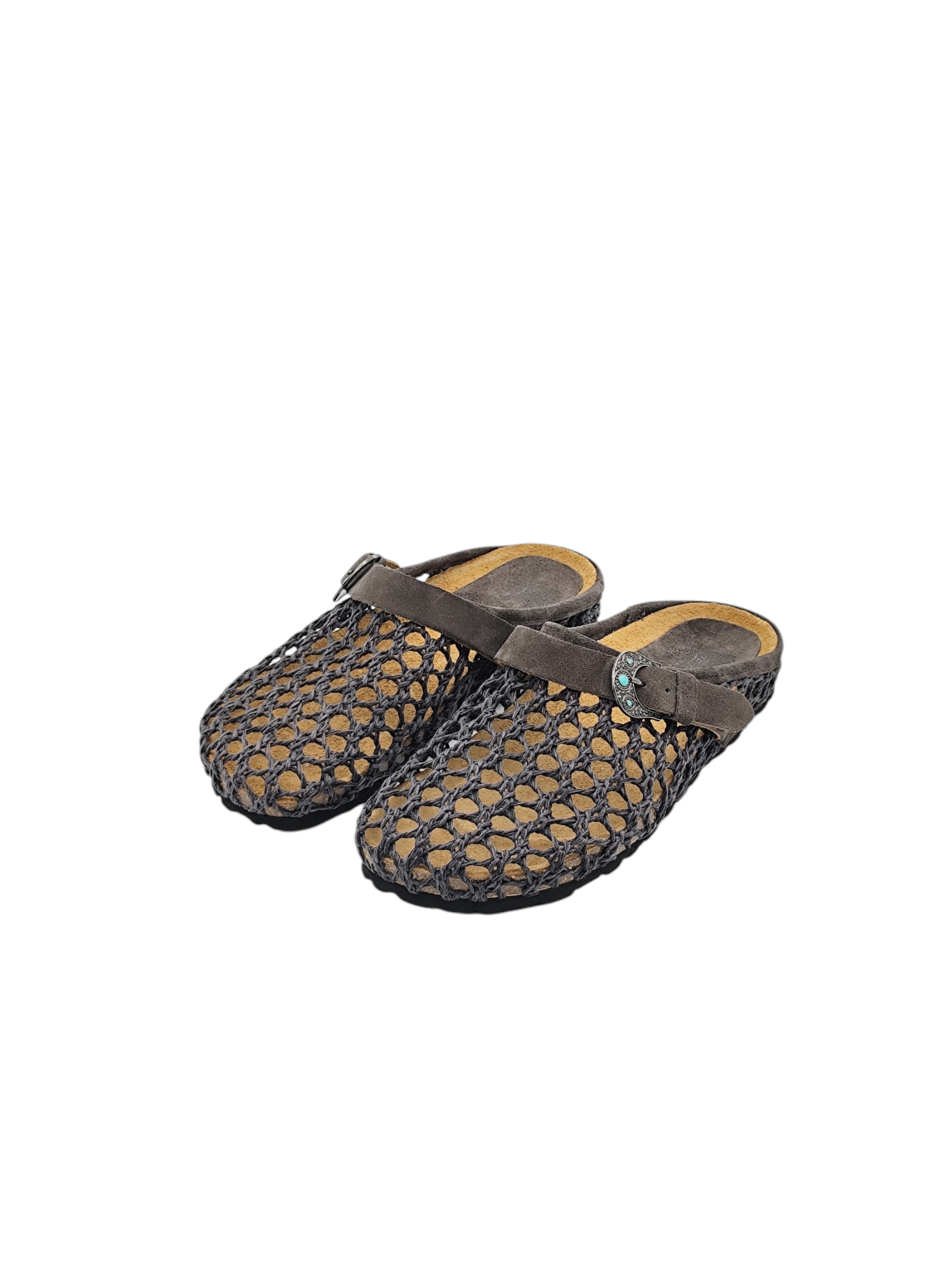 Sabot 1 fibbia con pietre color turchese, suola anatomica foderata in crosta di vitello, tomaia in intreccio color NERO.